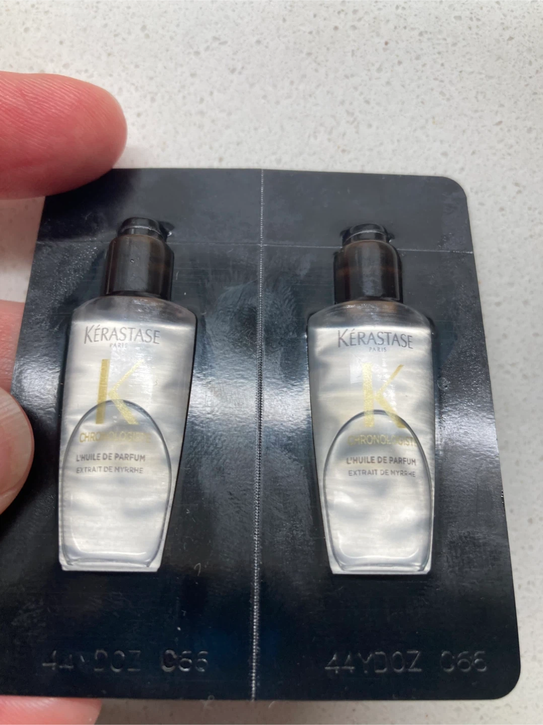 Selling two Kérastase hair oil samples. Total of 4 vials. One double pack is Elixir Ultime with camellia sauvage, and the other is Chronologiste with extrait de myrrhe. Perfect for trying out these luxurious hair oils!