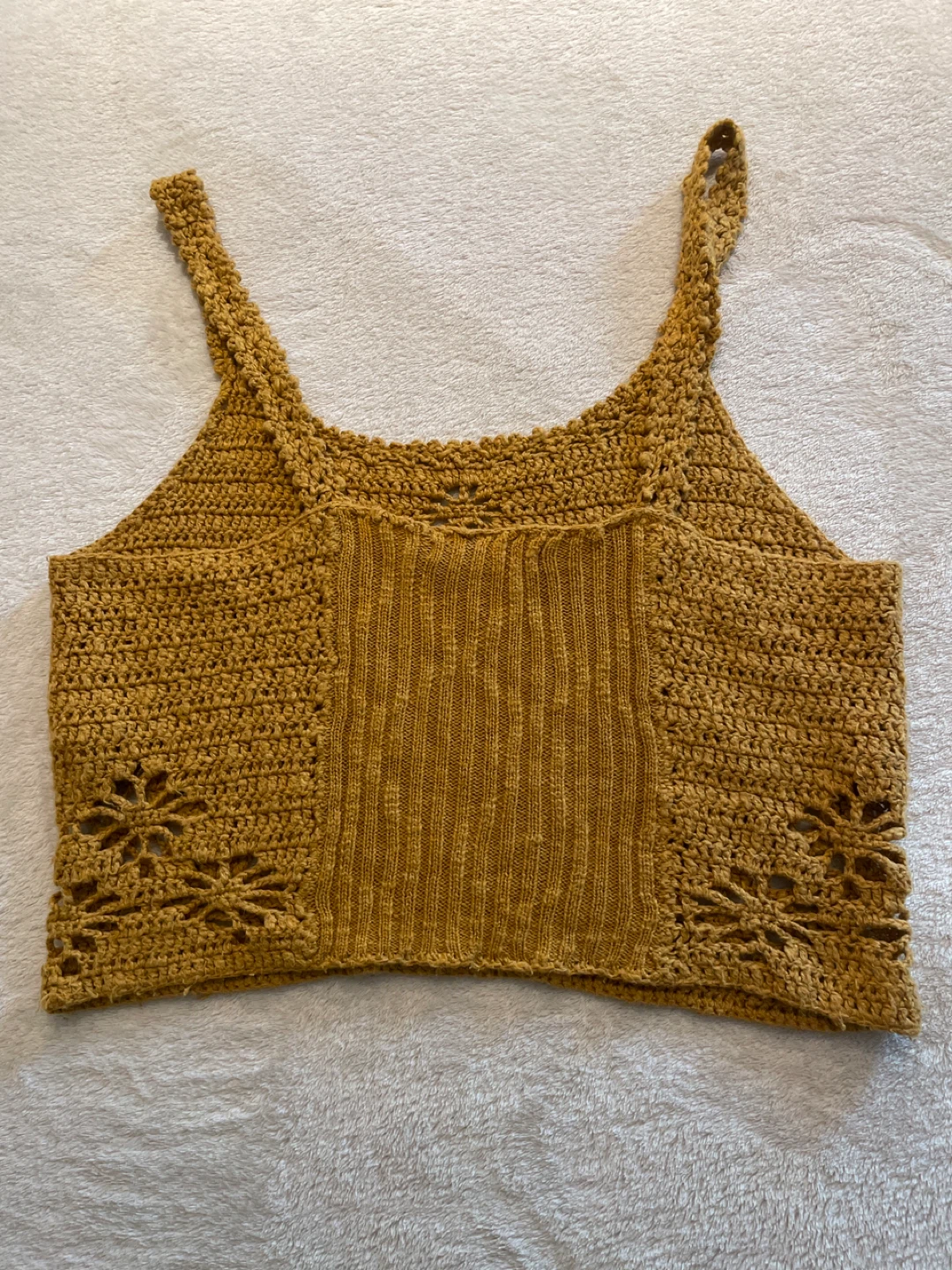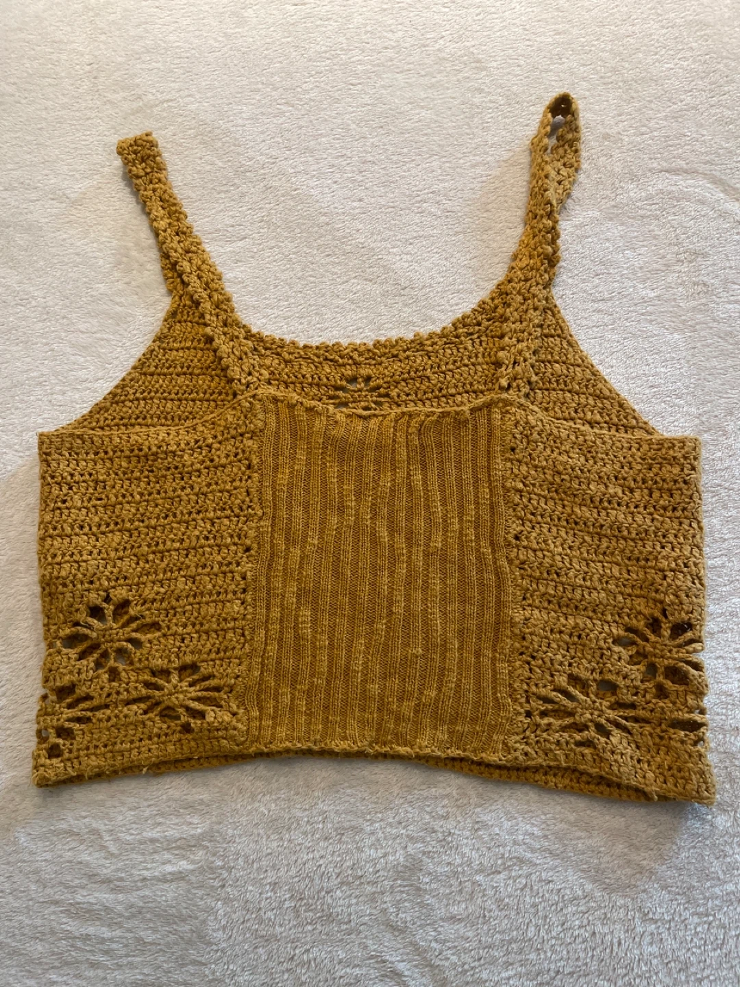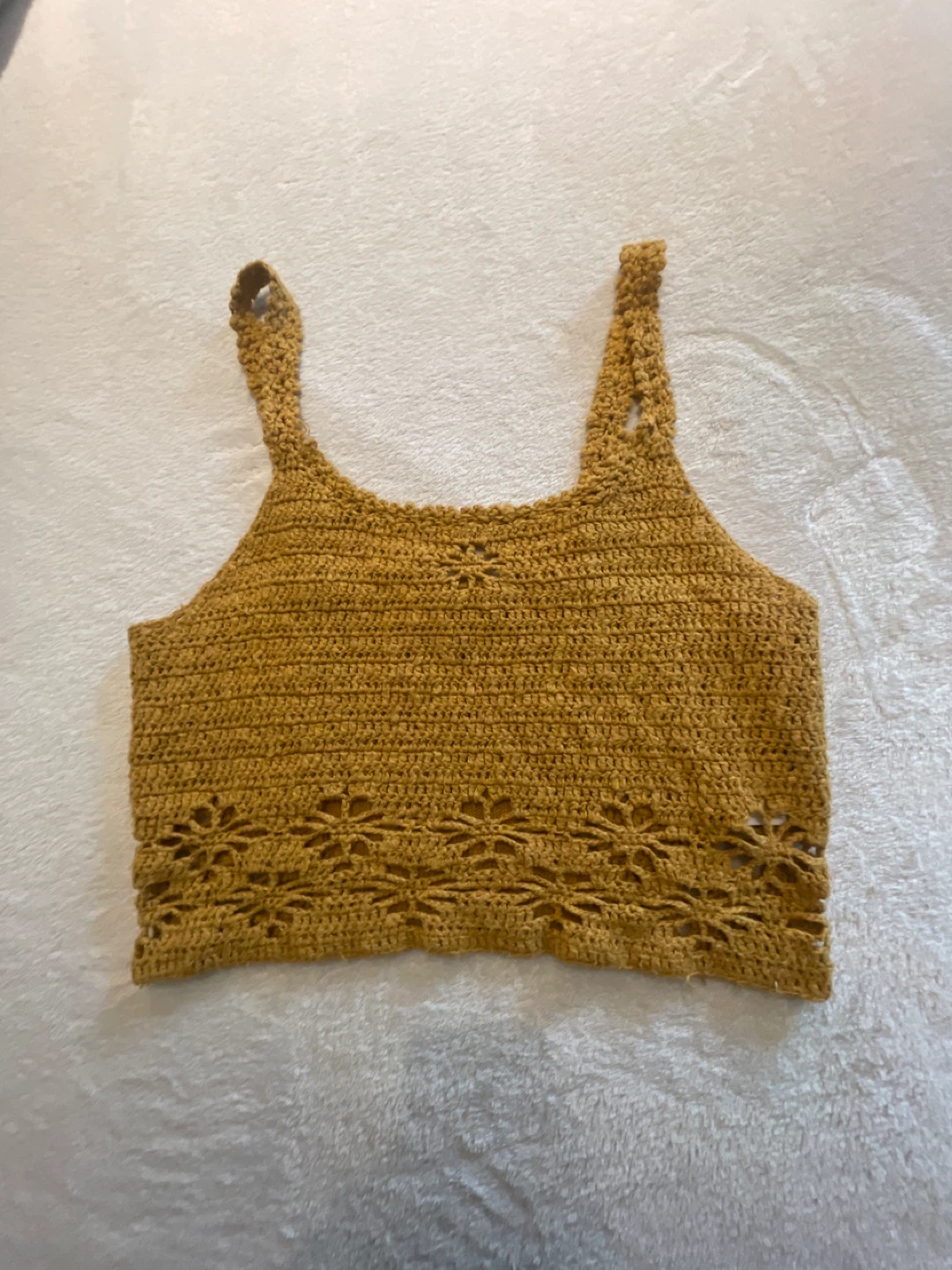 Selling a cute American Eagle crochet tank top! It's a size small and has a lovely mustard yellow colour. The crochet detailing is really pretty, especially the floral cutouts at the bottom. Perfect for summer!