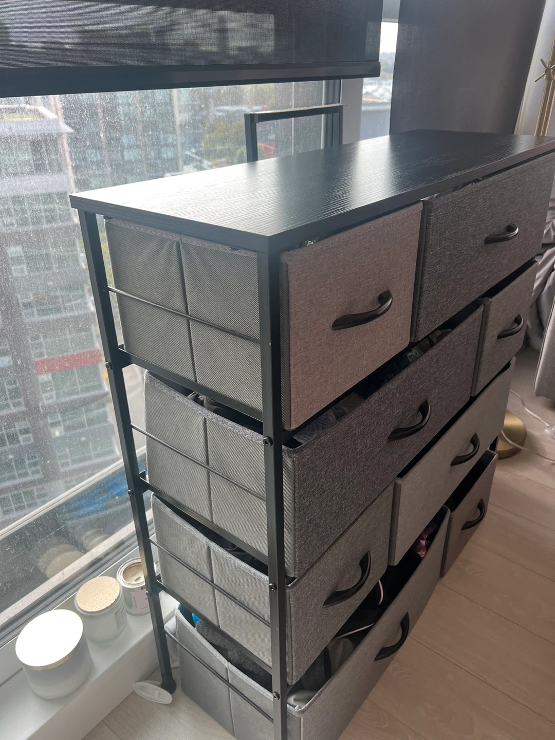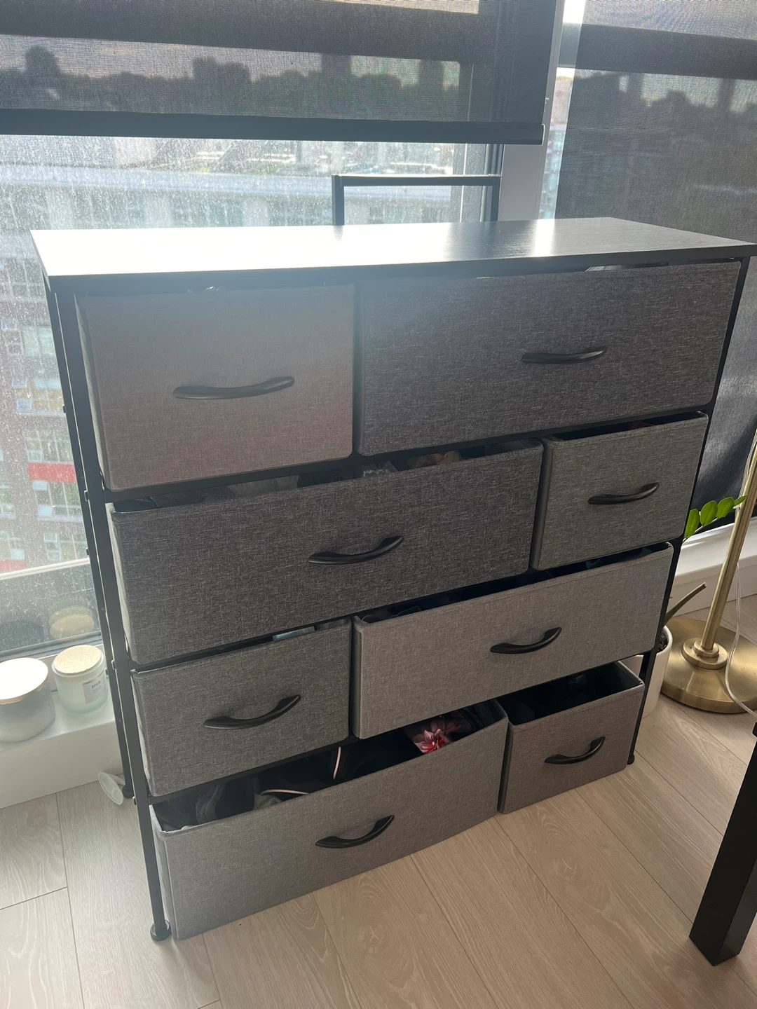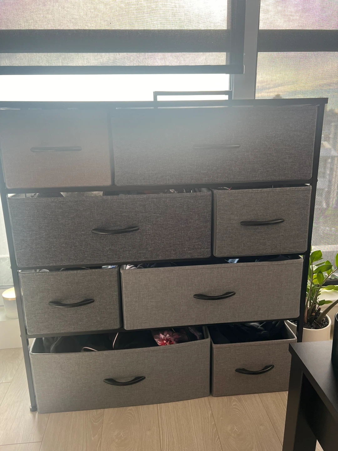 Selling a grey fabric drawer dresser. It features a black frame and multiple drawers of varying sizes, perfect for organizing clothes or other items. The dresser is in good condition and would be a great addition to any room where you have miscellaneous items to put away or clothes.