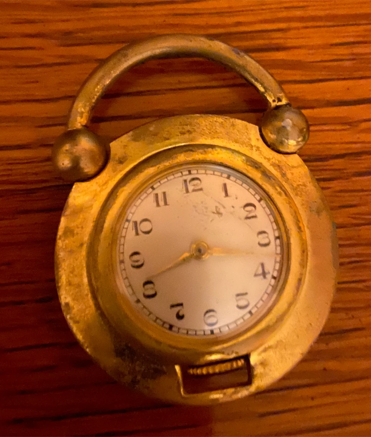 Selling a unique vintage purse watch with a gold tone finish. It features a distinctive design with visible gears on the back and a classic watch face on the front. This item is a charming piece to add to any collection