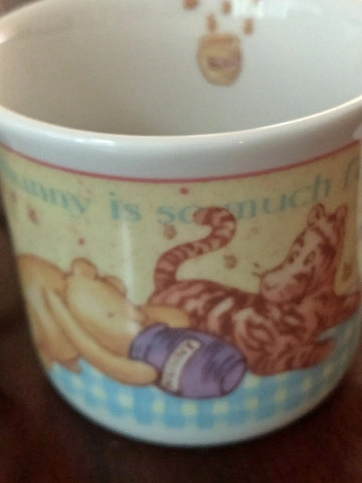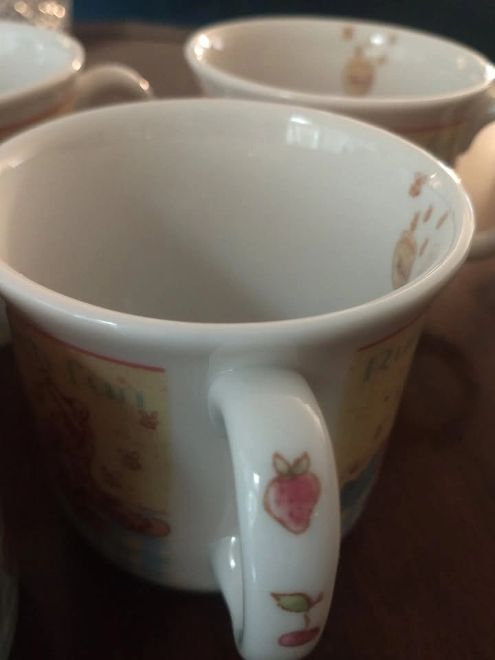 4 new fine china mugs featuring classic Pooh. Beautiful details. Purchased for a baby gift years ago and I put them away well hidden. Excellent condition. Excellent birth/ birthday/ gender reveal gift.