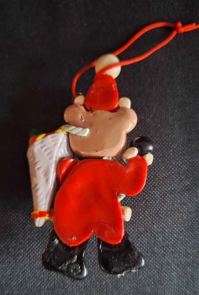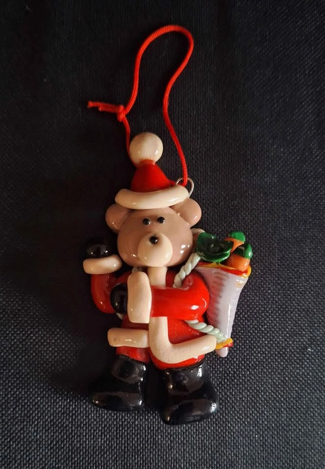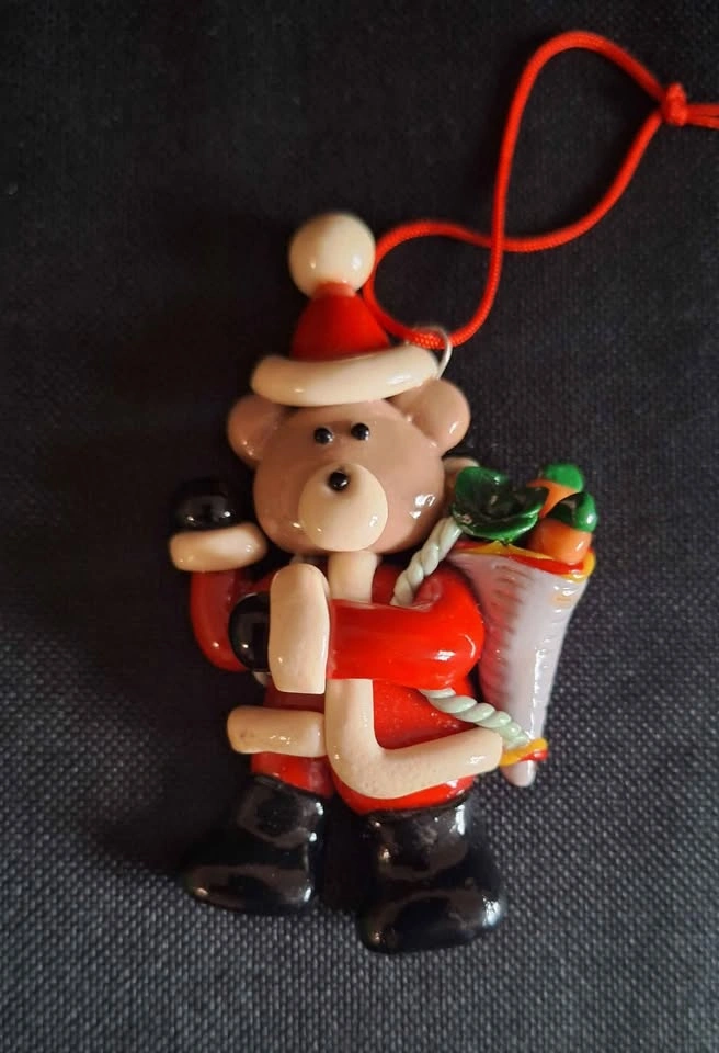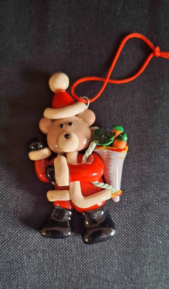 31This vintage Christmas ornament features a festive holiday bear design, perfect for adding a touch of nostalgia to your holiday decor. Made from glazed salt dough material, this unique ornament is multicolored and showcases a classic bear shape. It is a single item from a collection of ornaments, making it a special addition to your Christmas tree or holiday display. The vintage nature of the ornament adds to its charm and makes it a standout piece for collectors or those who appreciate traditional Christmas decorations.