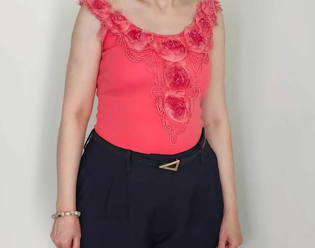 Here's a cute coral tank top with rose detailing around the neckline and front. It's perfect for adding a pop of colour to your wardrobe!