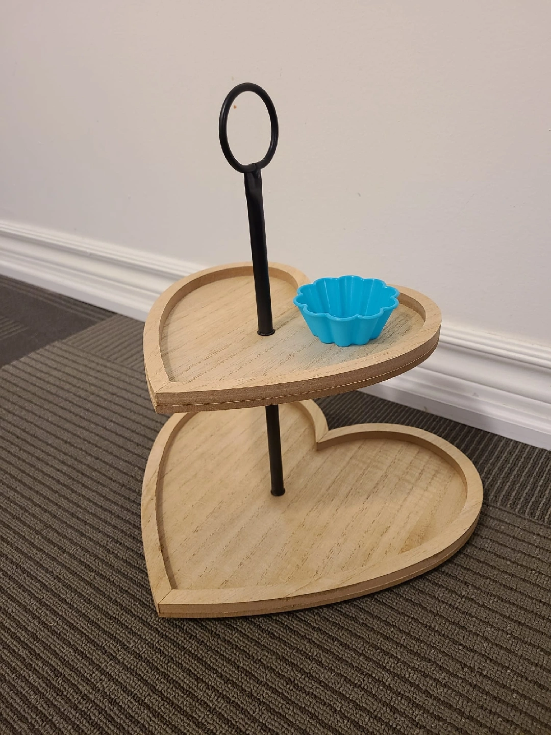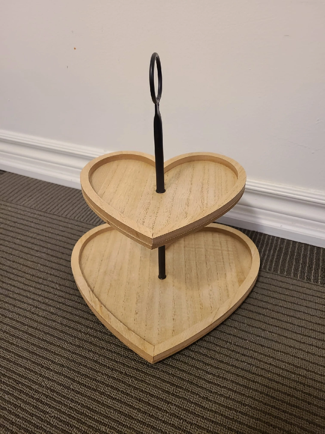Cute heart-shaped, two-tiered tray. The tray is made of light-coloured wood and has a black metal handle. It's in great condition and ready and ready for a new home!