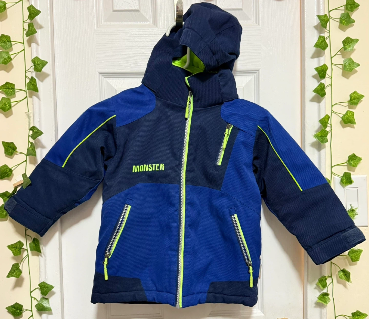 Size 4. Selling a gently used Monster brand kids' winter jacket! . It's a stylish blue colour with neon green accents. Perfect for keeping your little one warm and cozy during the colder months.