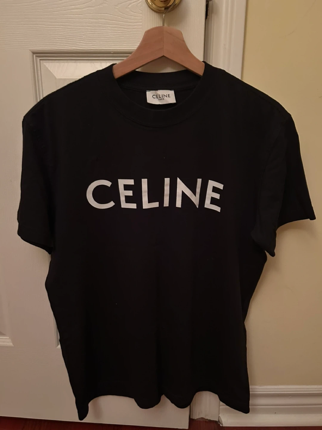Selling a black Celine T-shirt. It's in great condition and features the Celine logo prominently on the front. A stylish and comfortable addition to any wardrobe! The size is small