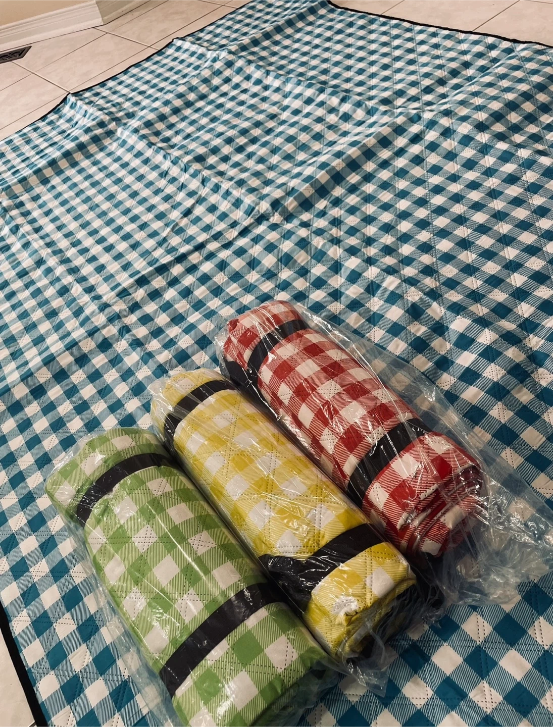 Selling a large picnic blanket with a cheerful yellow and white gingham pattern! It's in great shape and perfect for picnics, beach days, or just relaxing in the backyard. The blanket measures approximately 78 inches by 58 inches. It's lightweight and easy to roll up for carrying, making it super convenient for all your outdoor adventures Three colors in stock