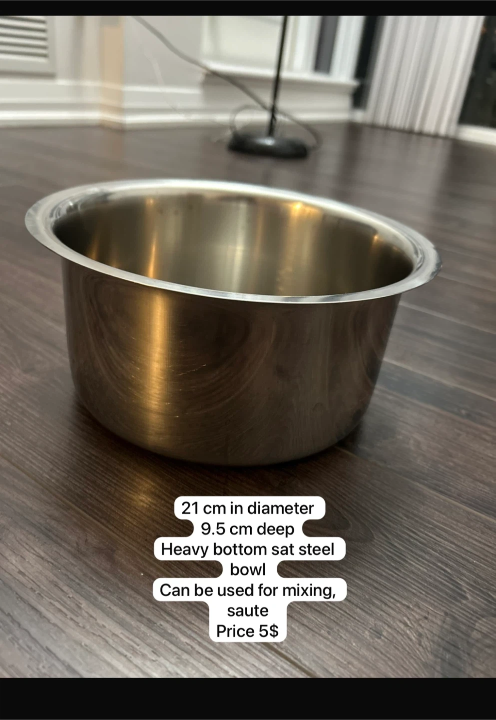 Stainless steel bowl with a heavy bottom, perfect for mixing or sauteing! It's 21 cm in diameter and 9.5 cm deep.