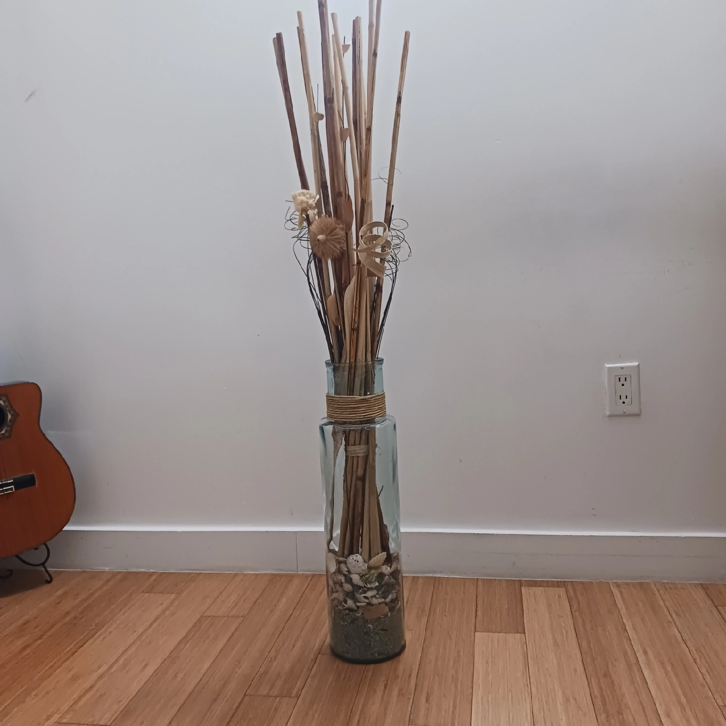 Elegant handcrafted glass vase filled with natural dried sticks, seashells, and beads. Each piece is uniquely arranged, creating a serene coastal aesthetic perfect for collectors or refined home décor. The twine accent adds a rustic touch, making it both decorative and timeless.
