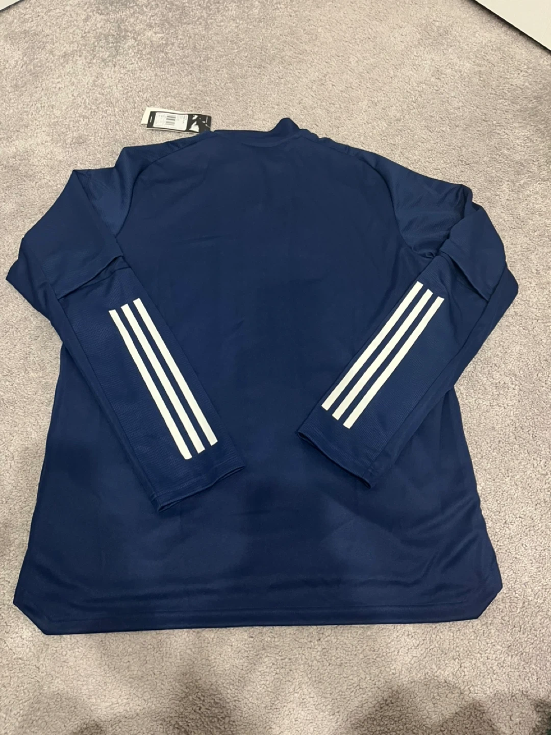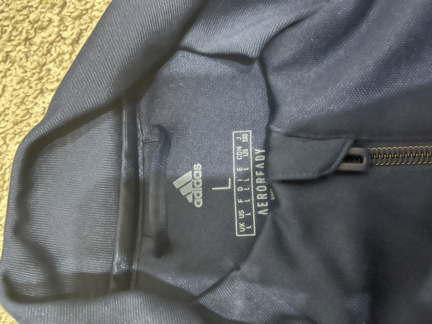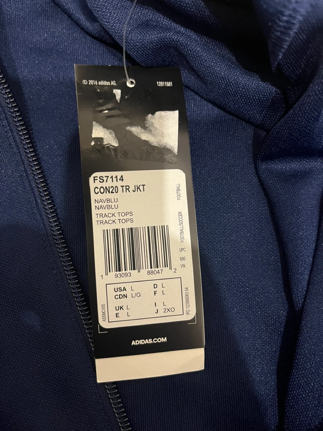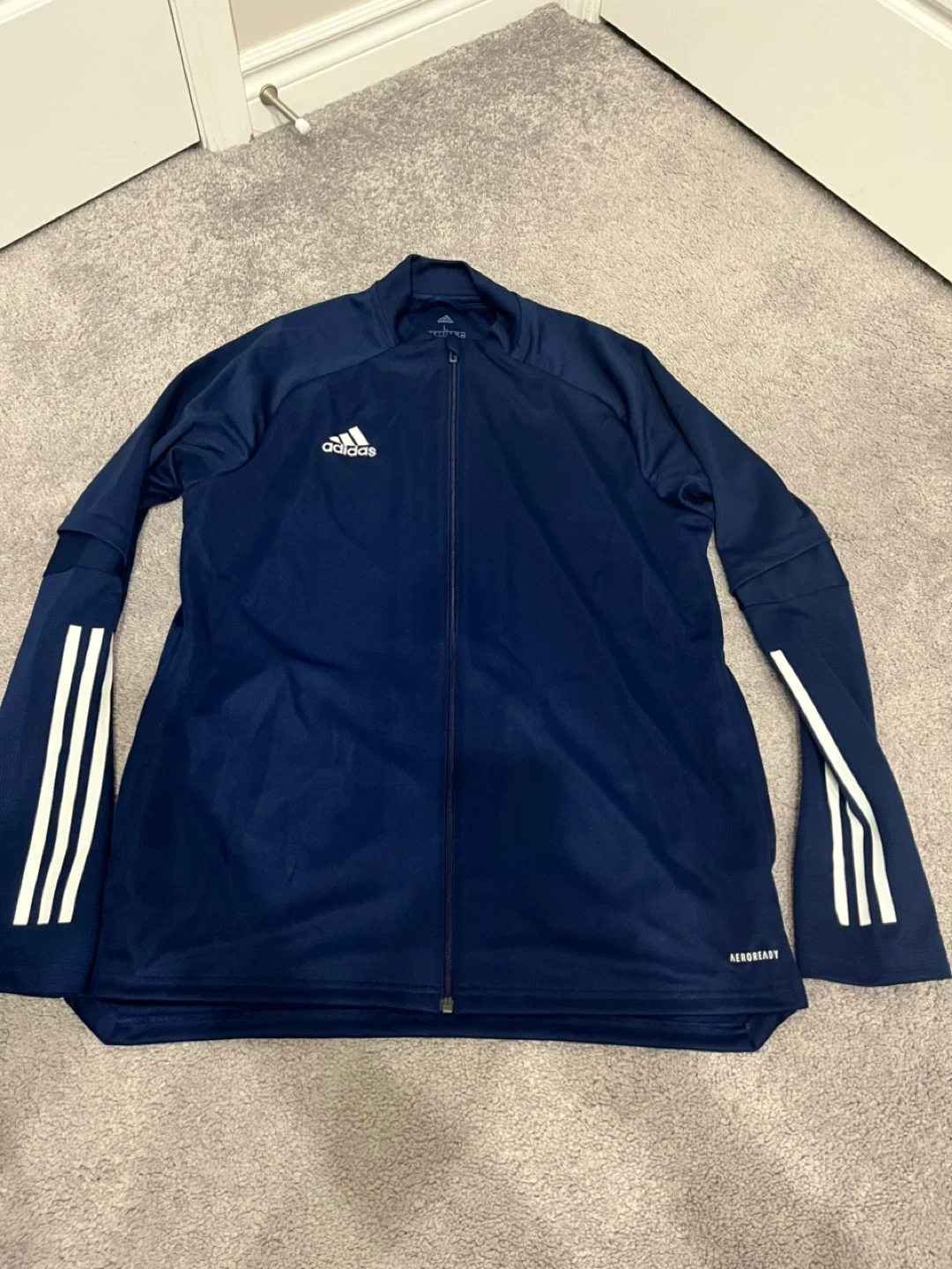 Selling a navy blue Adidas CON20 TR JKT track jacket in size L. It's in great condition and features the classic Adidas three-stripe design on the sleeves. Perfect for sports or casual wear!