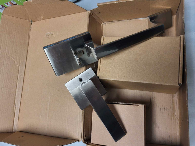 I'm selling a modern square door handle. It's a stylish addition to any home! These handles are new, unused, and still in their original packaging. * Sleek square design * Brushed nickel finish * Modern style. I'm thinking of pricing these at $45!
