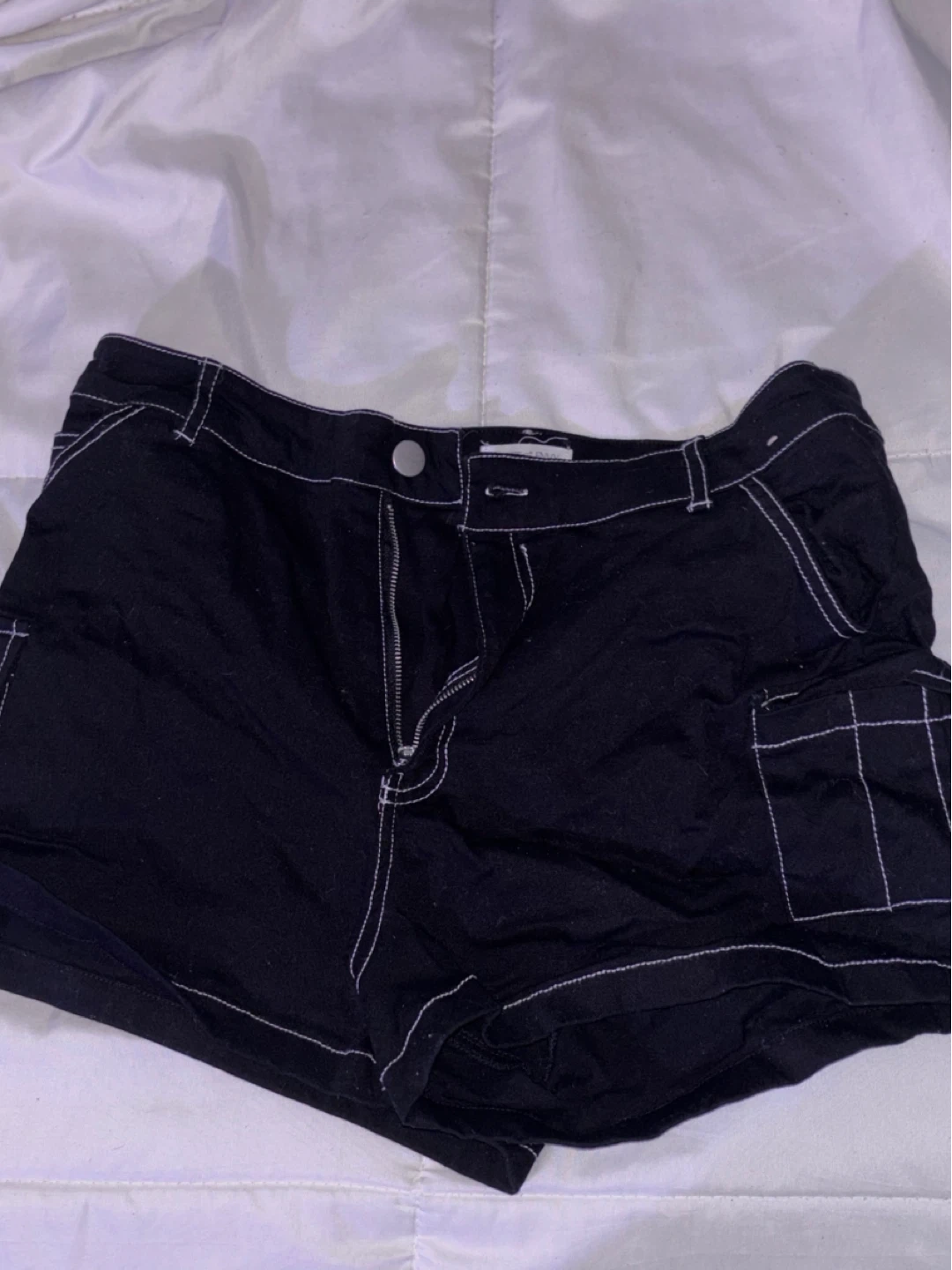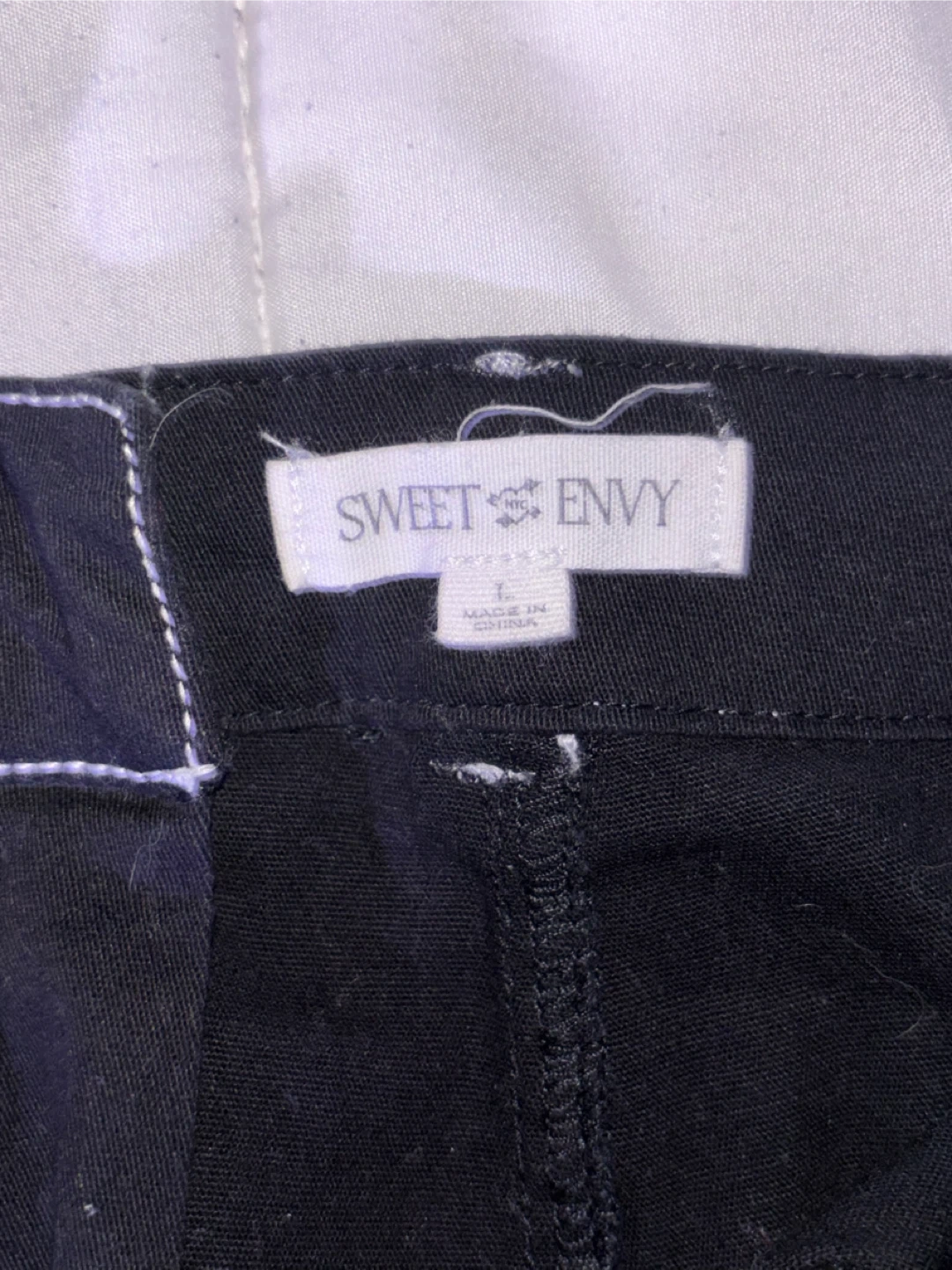 55Selling a pair of black shorts from Sweet Envy in size L. They feature a stylish design with white stitching details. Perfect for casual wear.