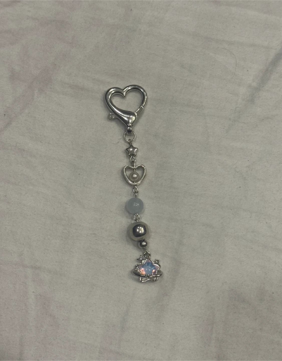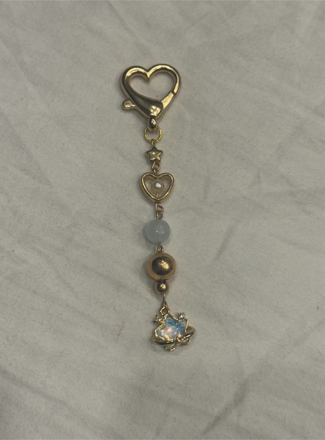 15Here's a cute charm with beads and a lobster clasp! It has a heart-shaped clasp and is decorated with beads and charms in silver and gold colours. Perfect for adding a little sparkle to your bag or keys