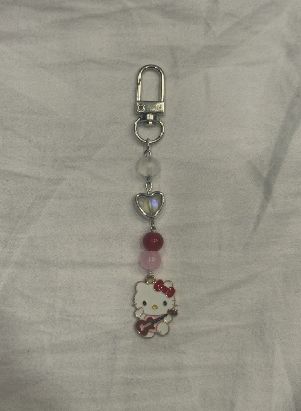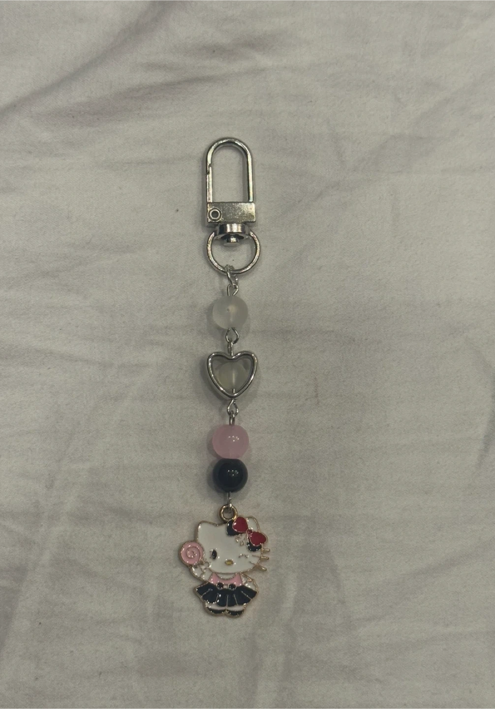 15Super cute Hello Kitty charm! It features a silver clip, beads in white, pink, and black, and a Hello Kitty pendant. Perfect for adding a touch of kawaii to your bag or keys