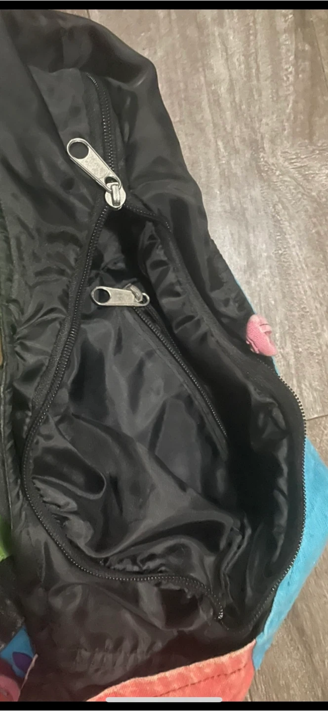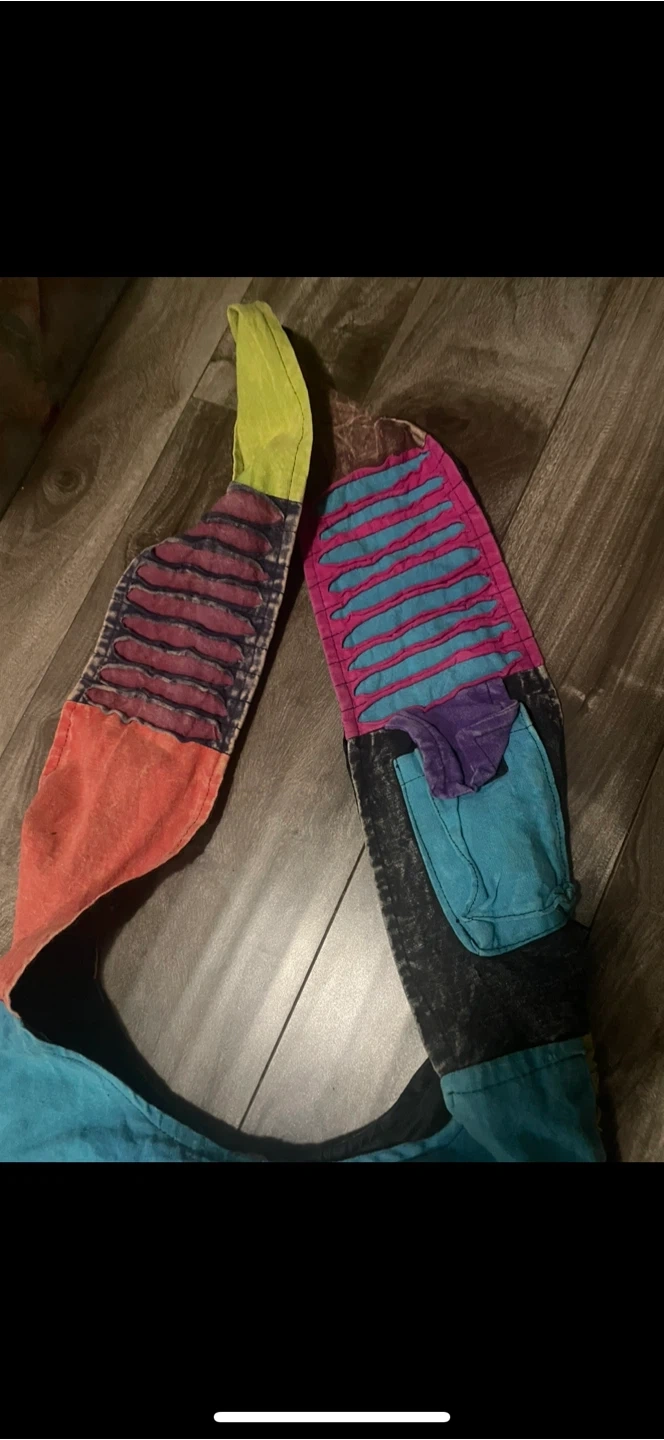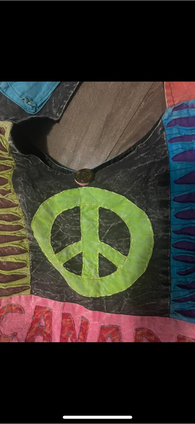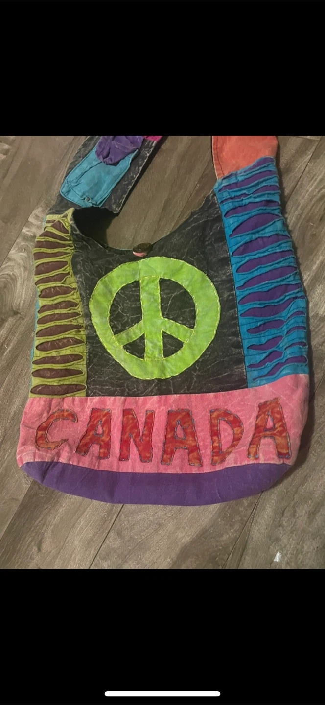 This unique handmade shoulder bag features a vibrant peace sign design and the word 'CANADA'. It's a colourful and eye-catching accessory, perfect for adding a bohemian touch to your outfit! The bag has a button closure.