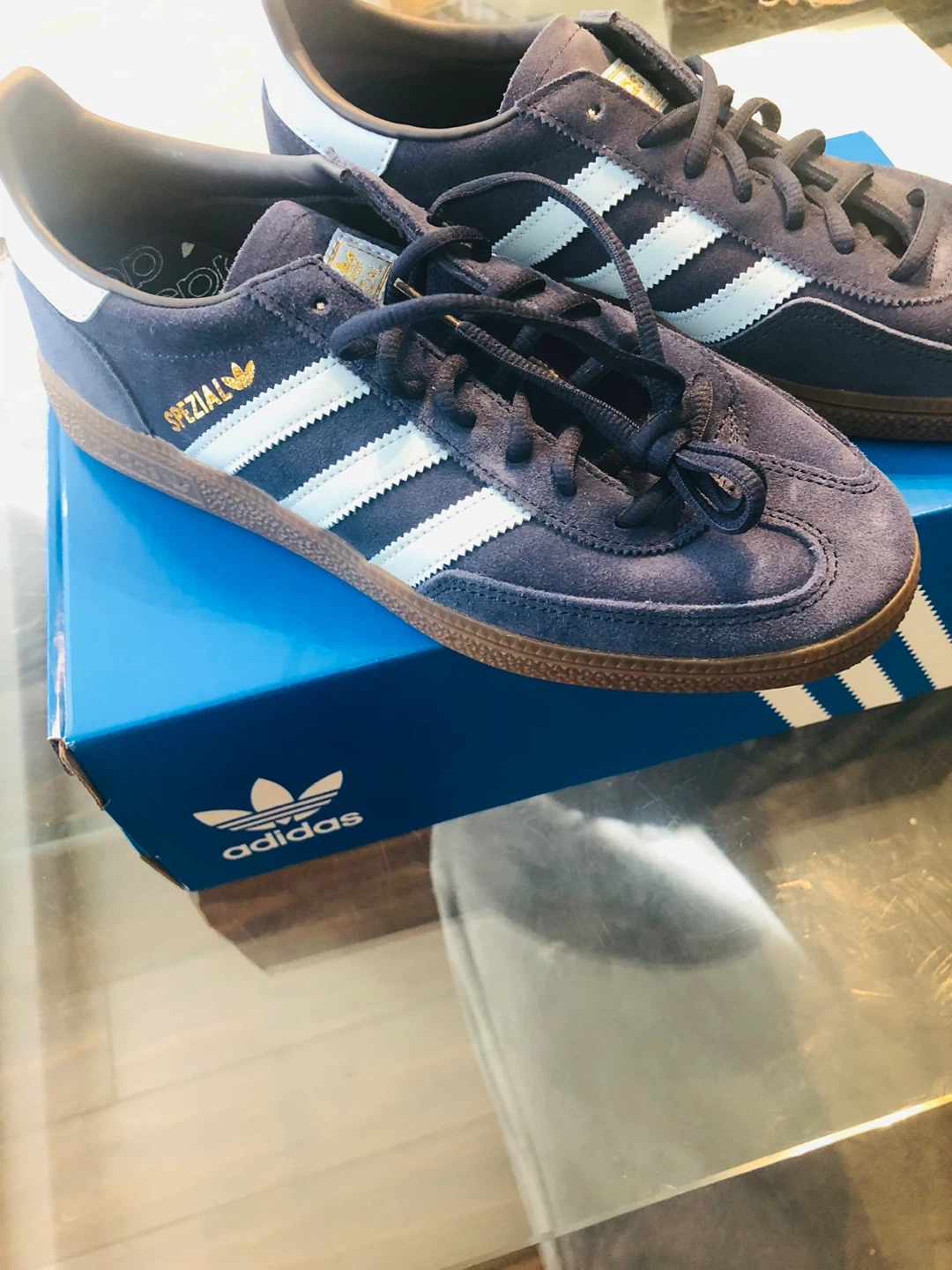 Selling a pair of Adidas Spezial shoes in blue suede! These classic sneakers are in great shape and come with the original box. Perfect for adding a touch of retro style to your wardrobe