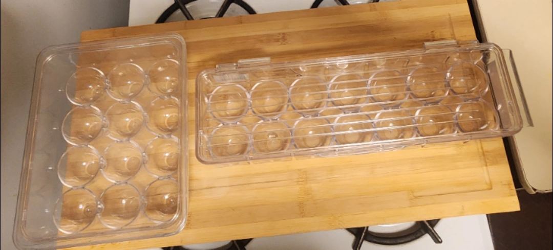 Keep your eggs safe and organized with these clear plastic egg holders! One holds 14 eggs and the other holds 12 eggs. Clearly shows when you are running low on eggs -No more opening the styrofoam or the egg carton just to check. They're in good condition and ready to use in your fridge.