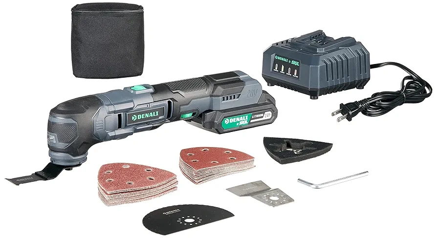 Selling a Denali 20V Oscillating Multi-Tool Kit. It includes a 2.0Ah battery, charger, and a 32-piece accessory kit. It also features a variable speed adjuster, LED light, and an Allen key for easy accessory changes. The tool has a wide 3.6-degree oscillating angle, perfect for optimizing cuts, sanding, and scraping