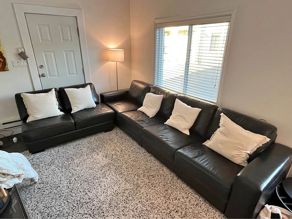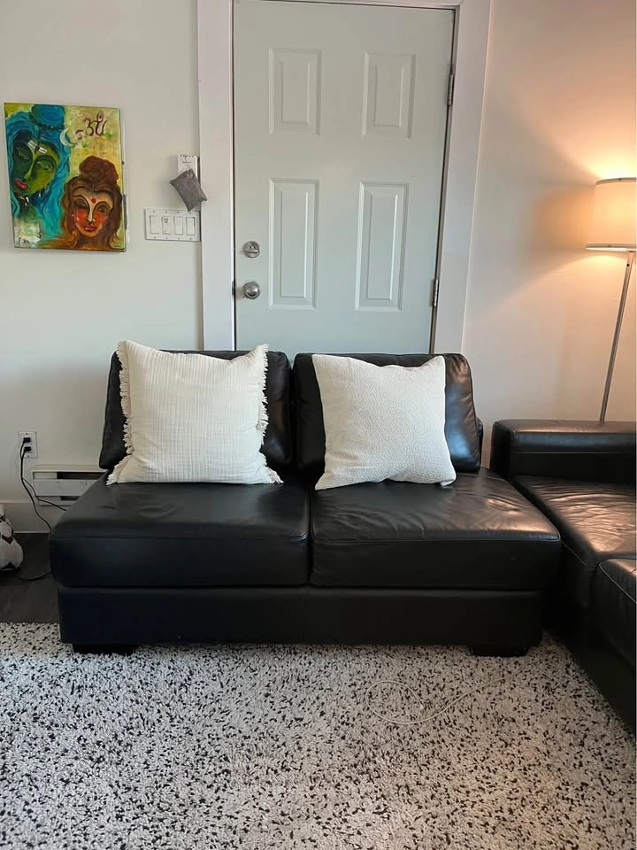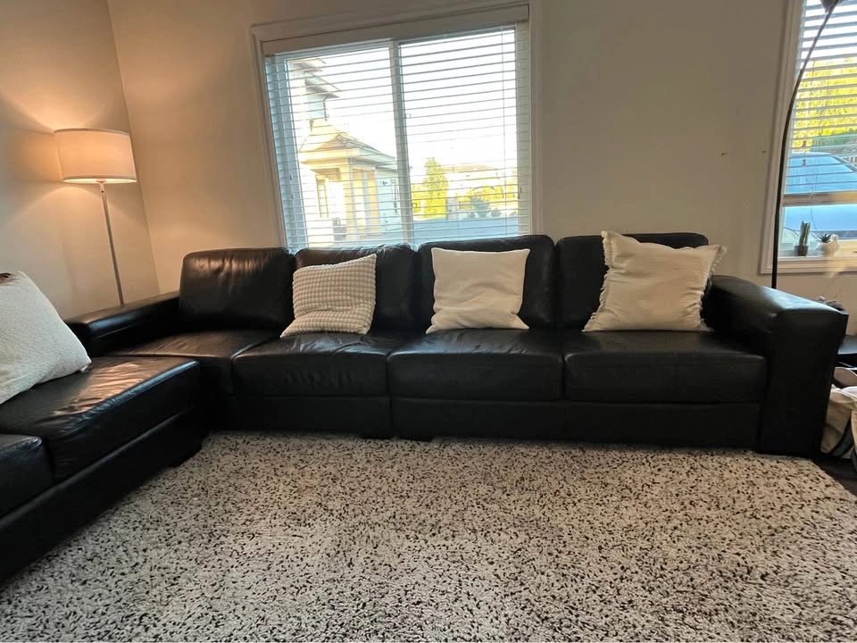 Premium quality black leather L-shaped sectional couch in really good condition. Very comfortable and stylish, comes in 3 easy-to-move sections.