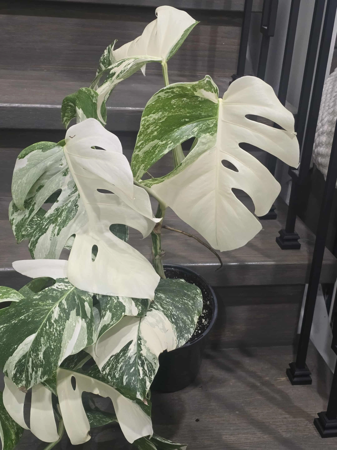Selling a beautiful variegated Monstera Albo plant! It's a lovely houseplant with unique white and green leaves. It comes in a black pot and is ready to brighten up your space