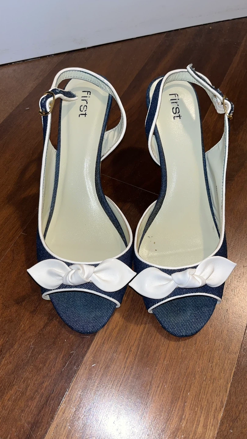 Cute denim slingback heels from First! They are a size 7 and feature a sweet little bow on the front. Perfect for adding a touch of charm to any outfit!