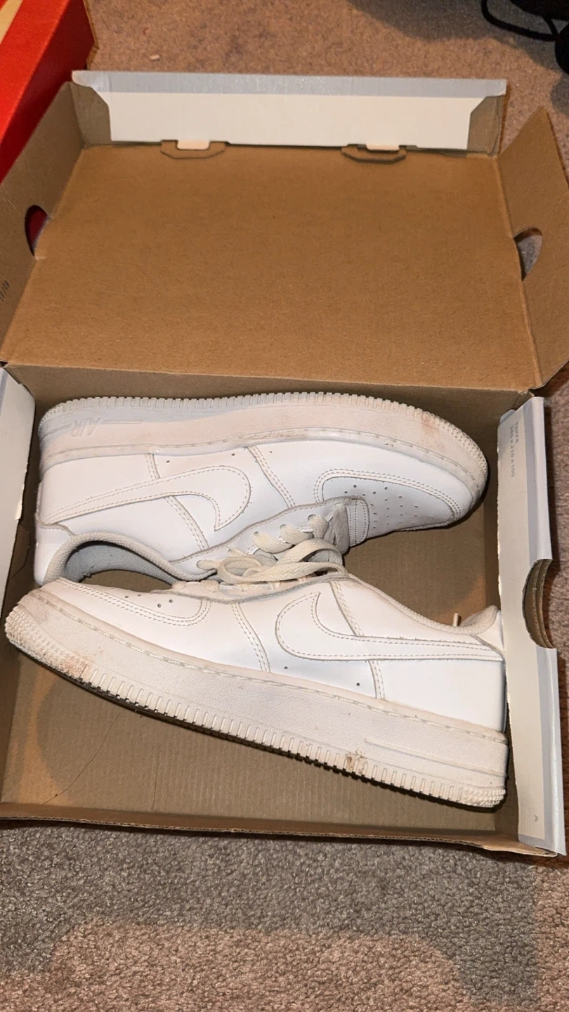 Selling a pair of Nike Air Force 1s in white. They come with the original box. They show signs of use, as pictured but in good condition. Just needs to be cleaned. Size 4.5 kids, 6 women’s.