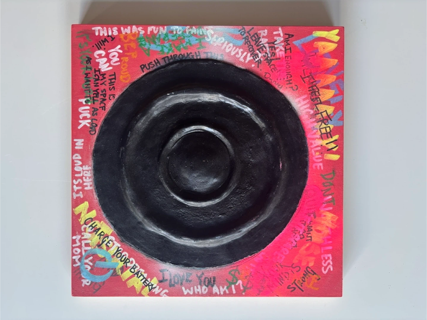 Unique mixed media artwork on a wood panel. Features a raised black circular design with colourful text and markings around the edges. A one-of-a-kind piece to add some character to your space!