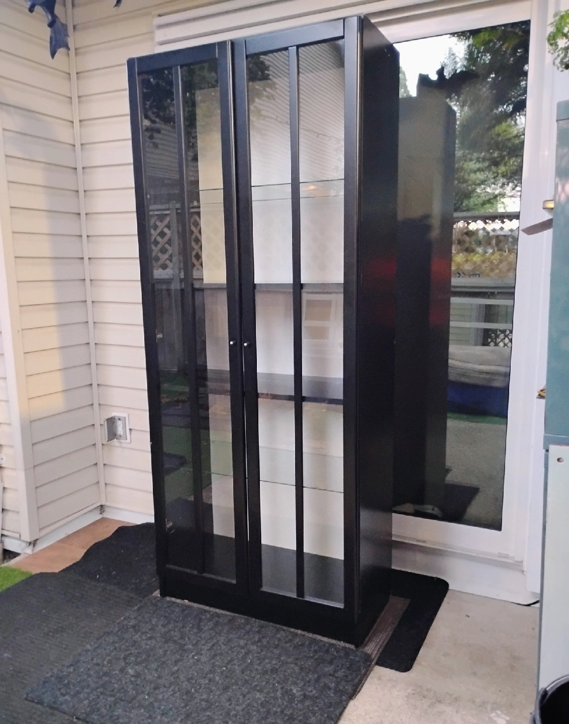 Sleek black display cabinet with classic glass french doors and 4 shelves (2 adjustable glass shelves). It's in good condition and perfect to display your favorite treasures, valuables or collectibles!