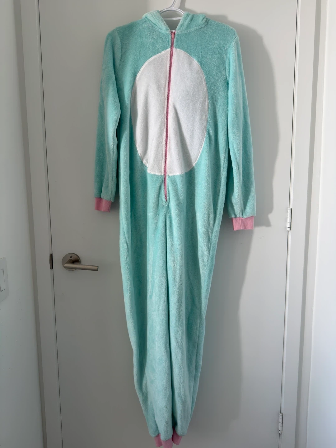 Super cute unicorn onesie from George! It's a size M/M and made with 100% polyester for the body and wings, and 56% polyester and 44% acrylic for the faux fur trim. Perfect for cozy nights or costume parties!