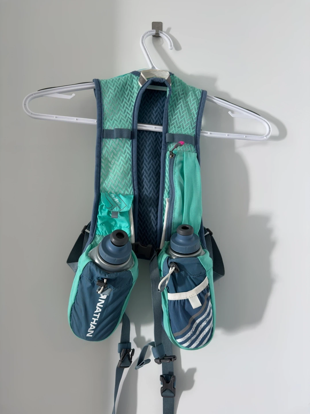 This Nathan hydration vest is perfect for running or hiking! It's in great condition and ready for your next adventure. It features a lightweight design and comfortable fit. Includes bottles.