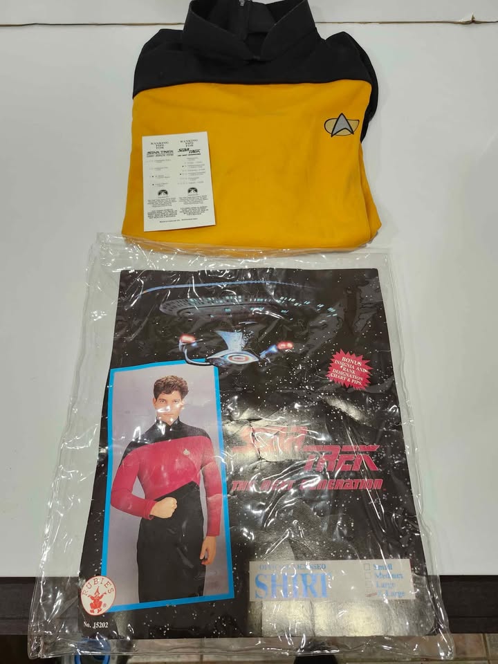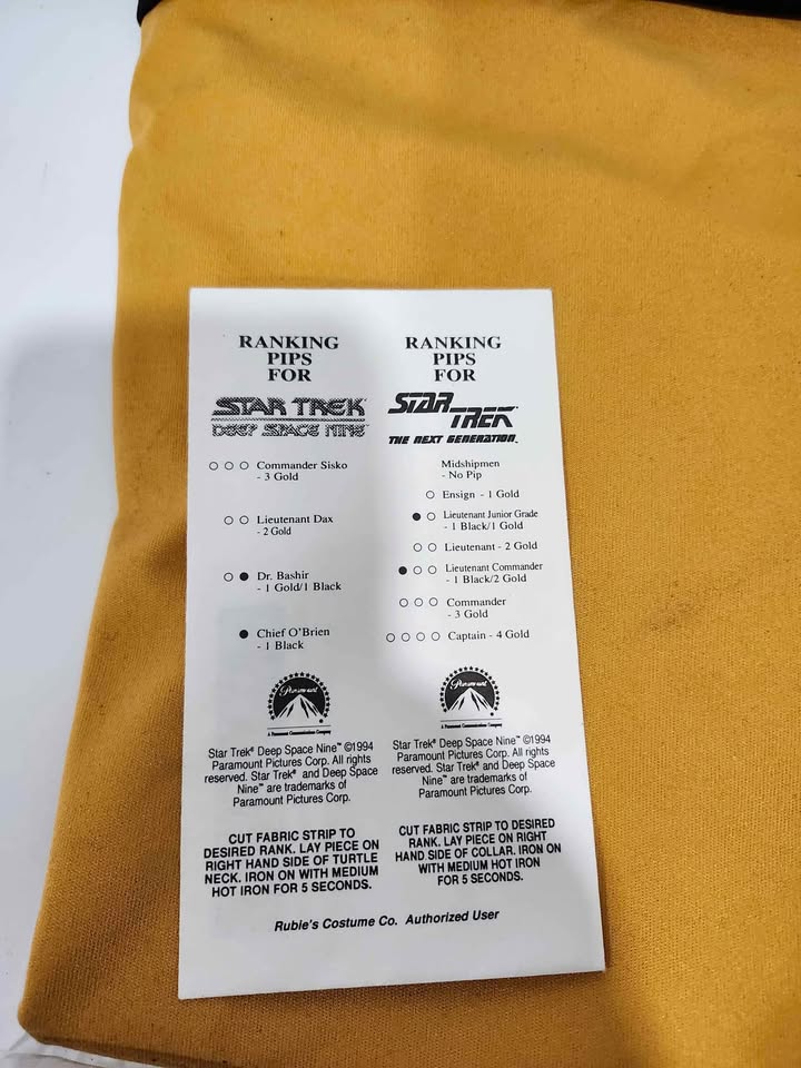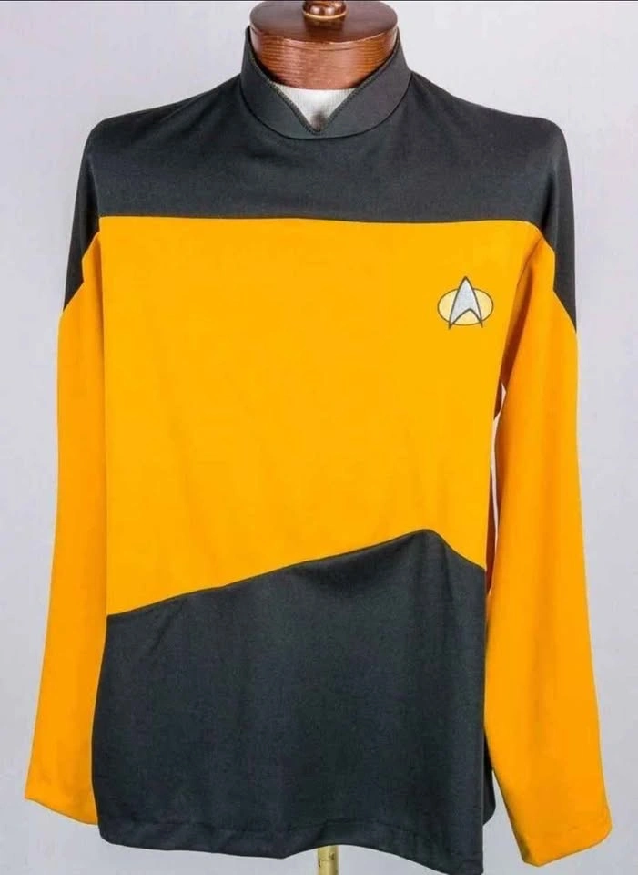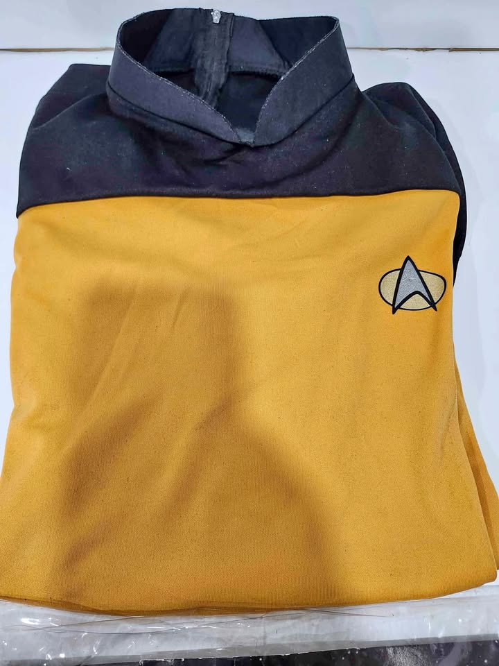 This costume is the classic mustard yellow colour with a black v-neck collar. There are gold ribbon bands around the sleeves on both arms. The Star Trek Insignia is embroidered into the left upper chest region.