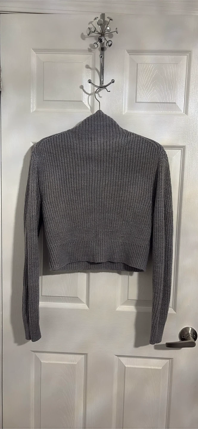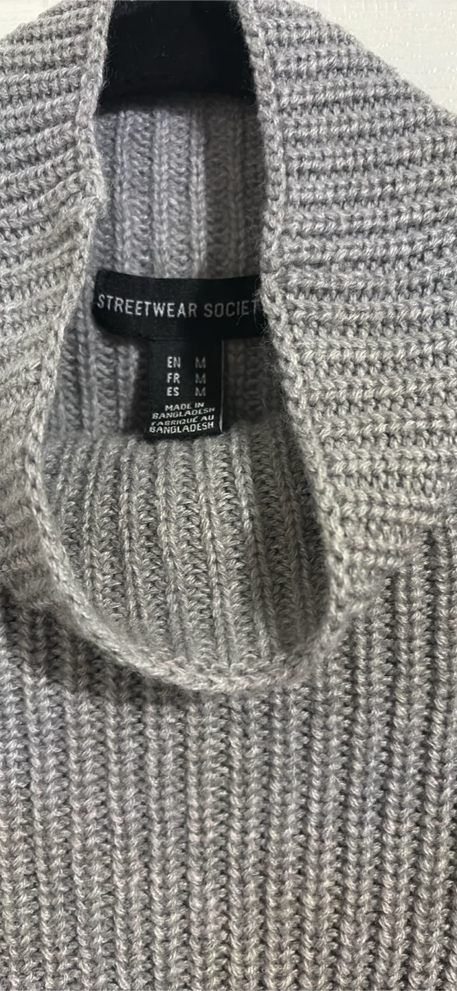 Cozy up in this Streetwear Society knit sweater! It's a lovely grey colour and a size medium. The material is 100% acrylic, so it's easy to care for. It's in great condition and ready for a new home