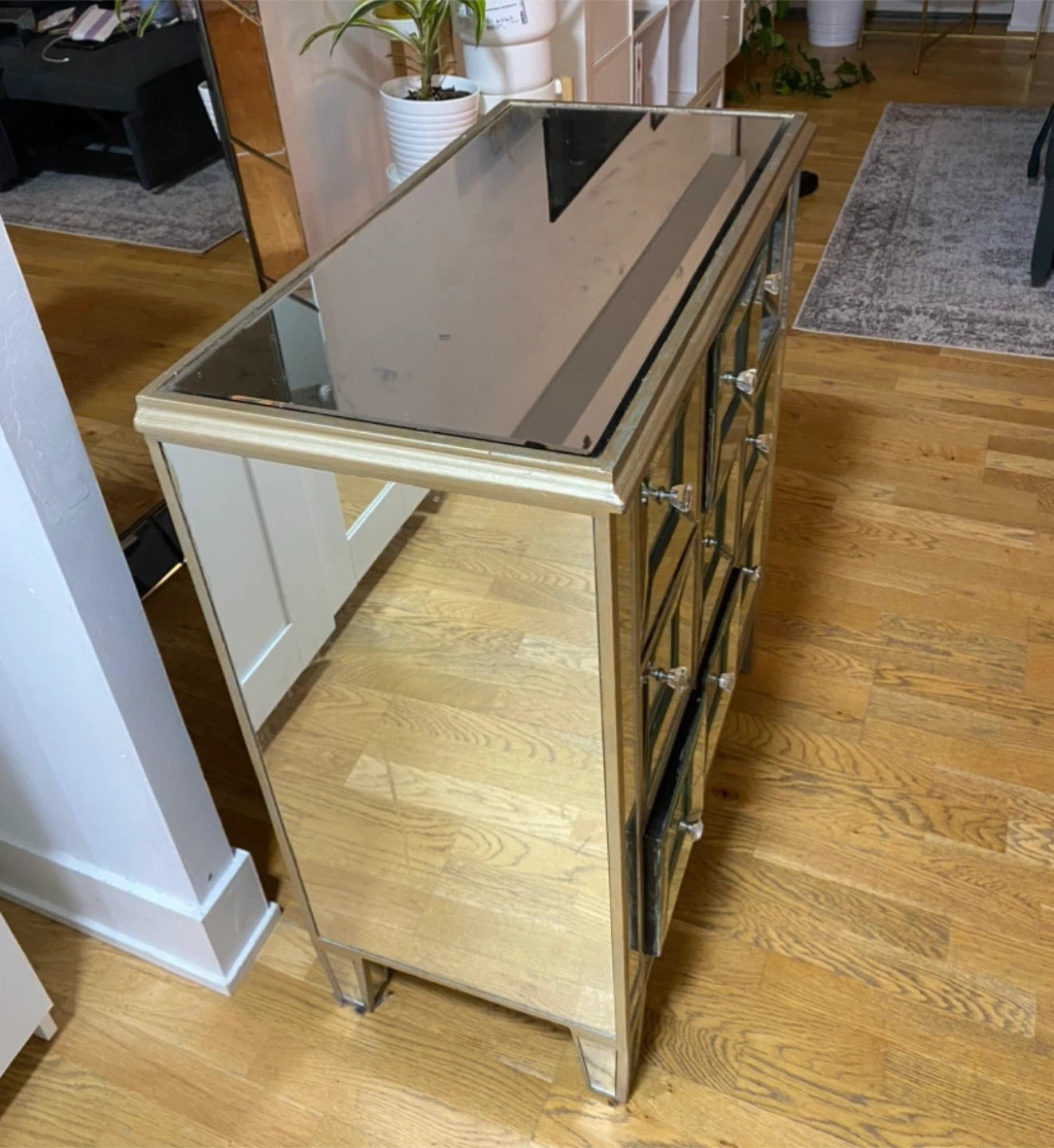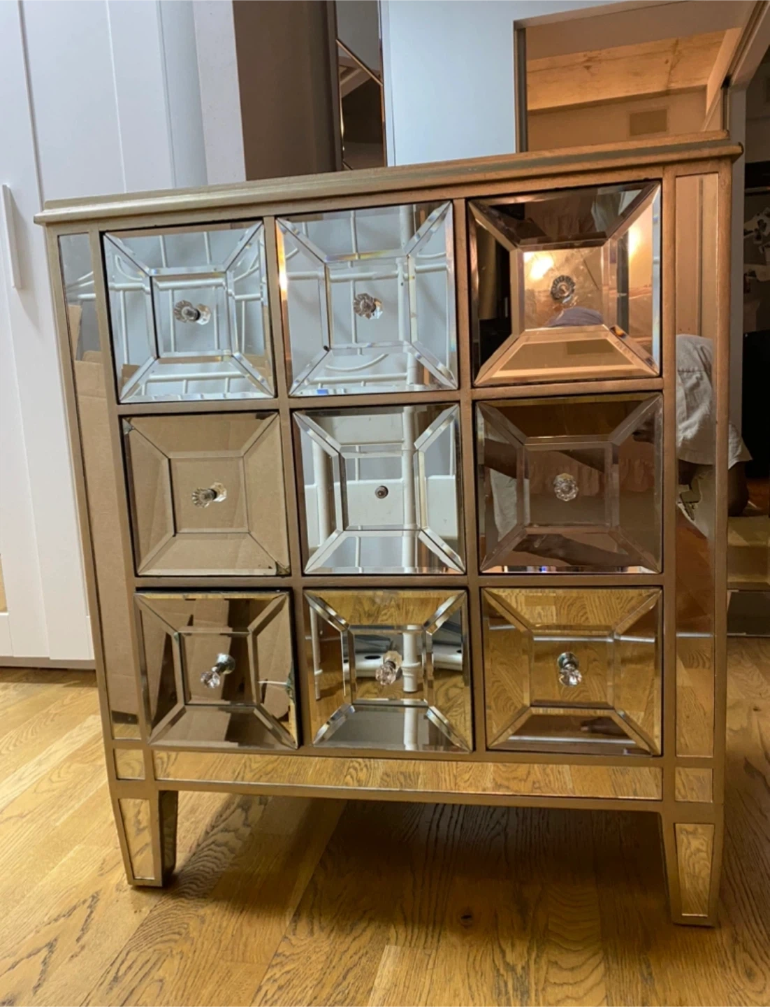 Selling a beautiful mirrored accent chest with 9 drawers. It's a stylish piece that adds a touch of elegance to any room. The chest features a mirrored finish on all sides, creating a stunning visual effect. Perfect for storing small items and adding a decorative touch to your space!