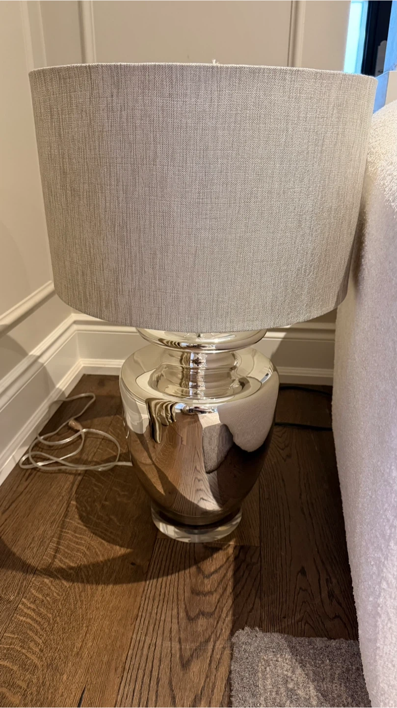 Selling a stylish table lamp featuring a shiny silver base and a neutral grey shade. It's in great condition and would look lovely in any room