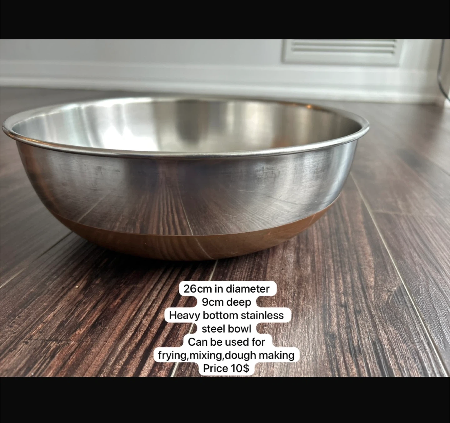 Stainless steel mixing bowl with a heavy bottom. It's 26cm in diameter and 9cm deep. Great for frying, mixing,marinade or making dough!