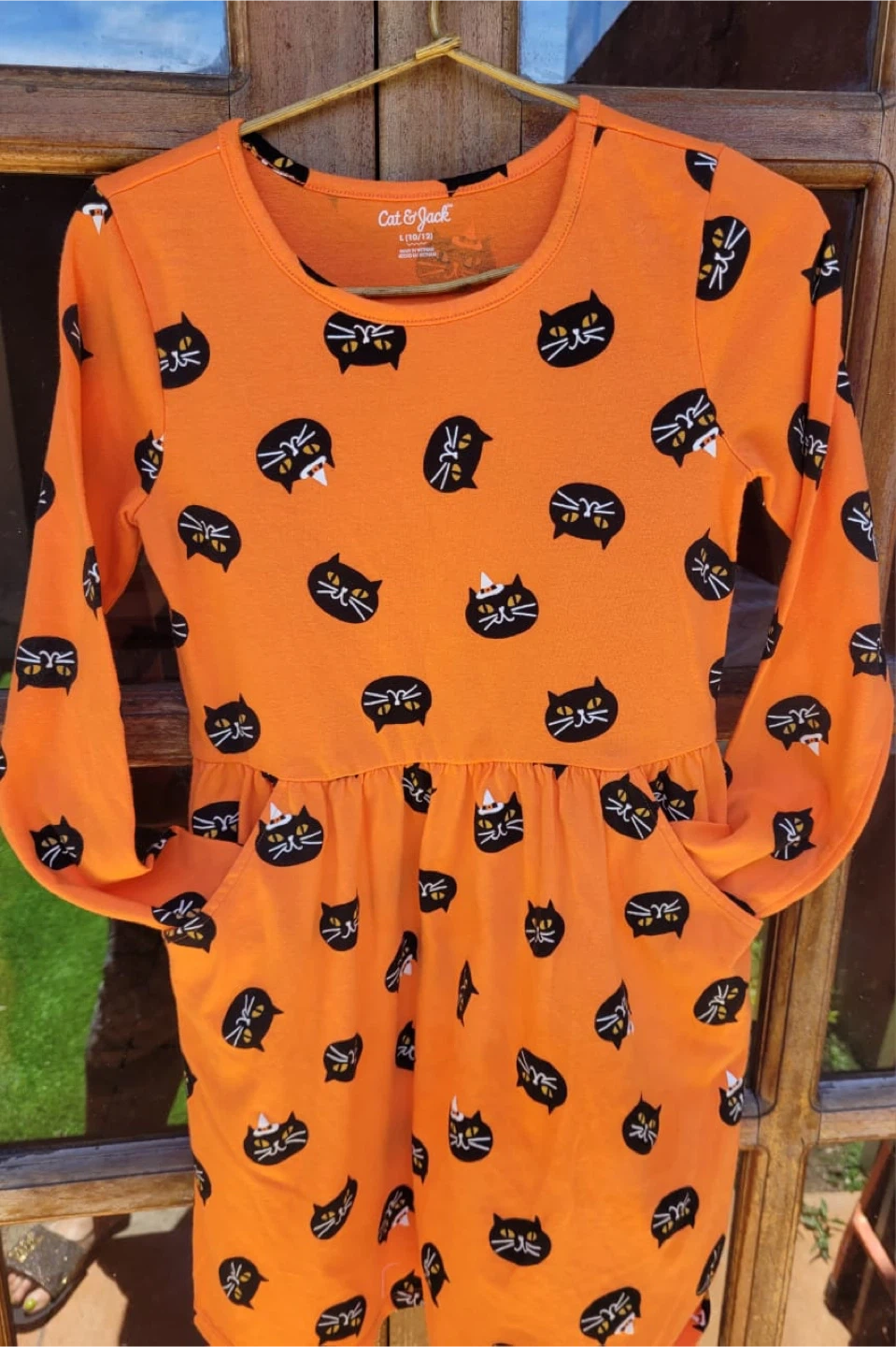 15Cute Cat & Jack dress in size L (10/12)! The dress is orange with a fun black cat print. It has long sleeves and pockets, perfect for everyday wear