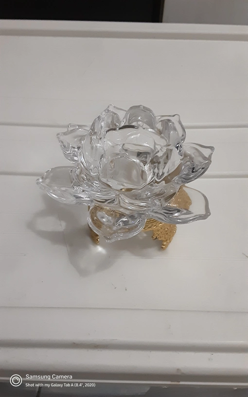 Selling a beautiful crystal flower candle holder! It features a clear crystal flower design with a gold-coloured base. It would look lovely in any room