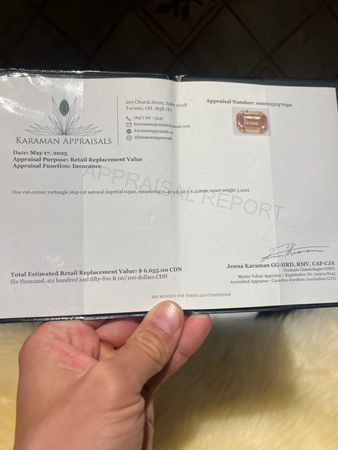 Selling a one-cut corner rectangle step cut natural imperial topaz. It measures 11.40 x 8.06 x 6.22mm, exact weight 5.20ct. The total estimated retail replacement value is $6,655.00 CDN