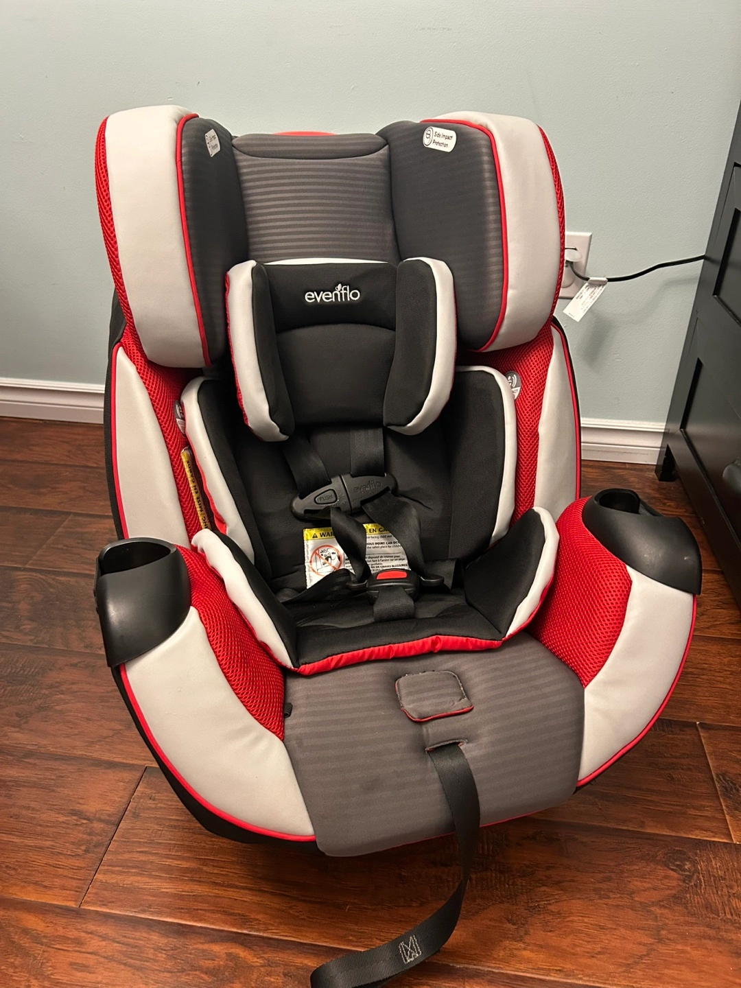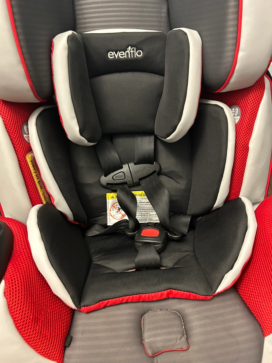 Selling an Evenflo car seat with the Easy Click installation system! It's in good condition and ready for a new home. The car seat features a red, grey, and black colour scheme.