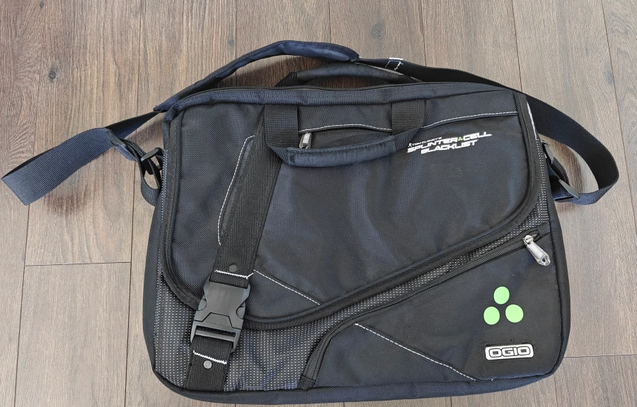 This is an OGIO laptop messenger bag with Splinter Cell Blacklist branding. It's NEW and ready to carry your laptop and accessories. It's a black laptop bag featuring design elements from Splinter Cell Blacklist. It features a checkpoint-friendly design for easy travel. The bag is black with some green accents and has multiple compartments for organization