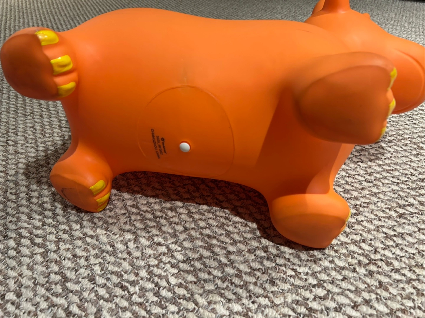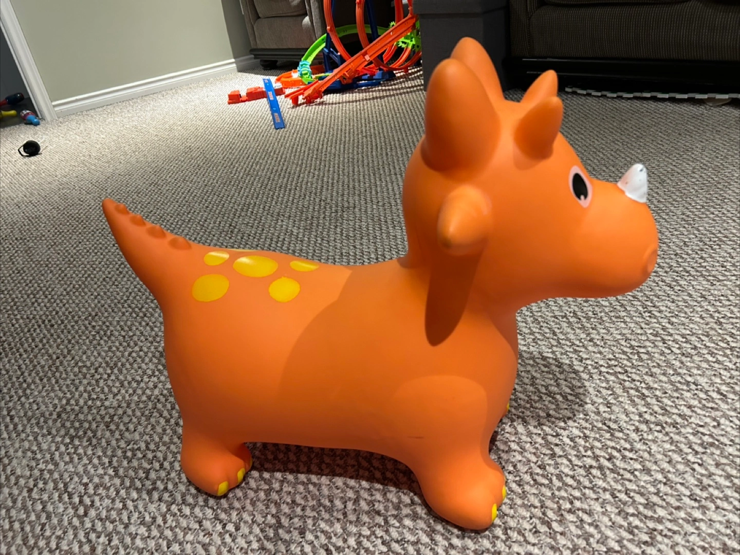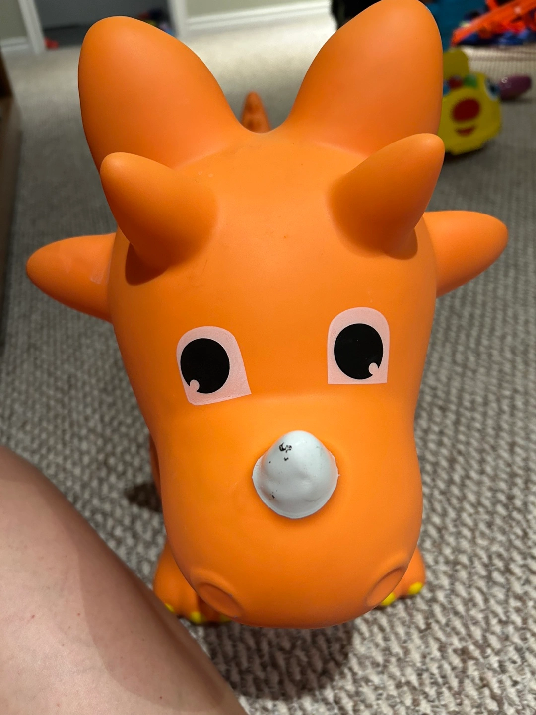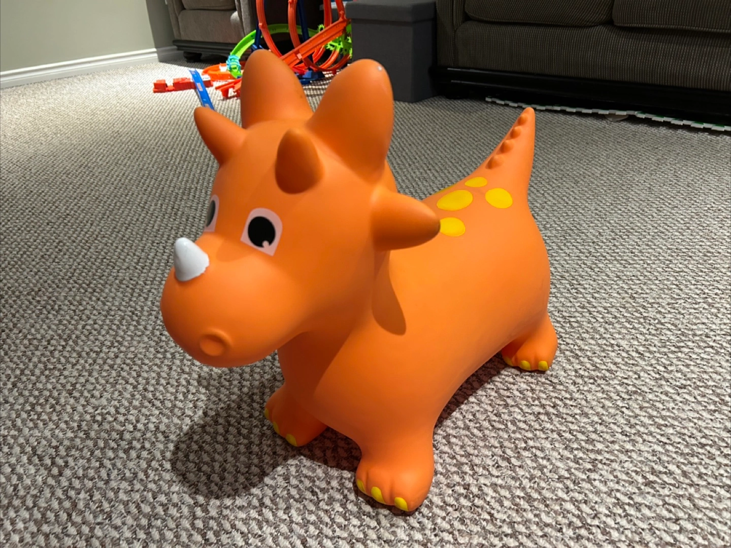 Selling a fun orange dinosaur bouncy toy! It's in great shape and ready for a new home. Perfect for toddlers who love to bounce and play. It has yellow spots on its back and cute little horns