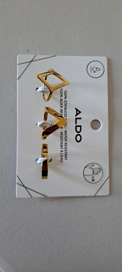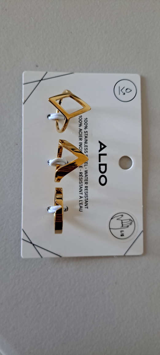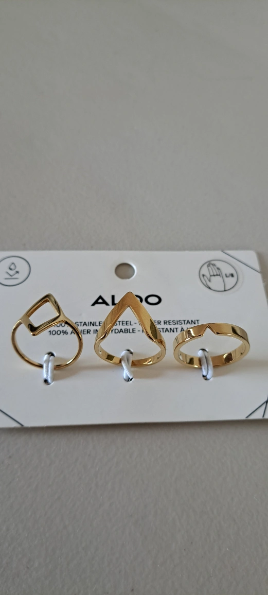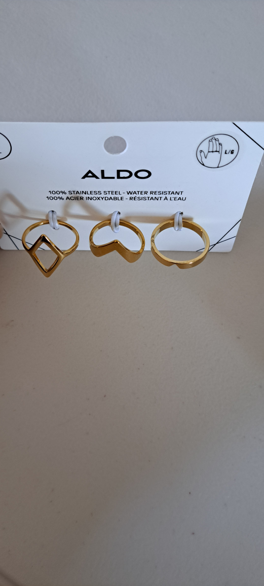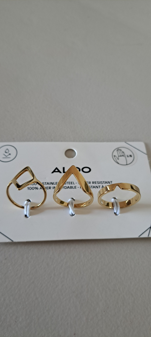 Selling a set of three Aldo gold rings. They are made of 100% stainless steel and are water-resistant. Size is L/6. Brand new never even removed from tag.