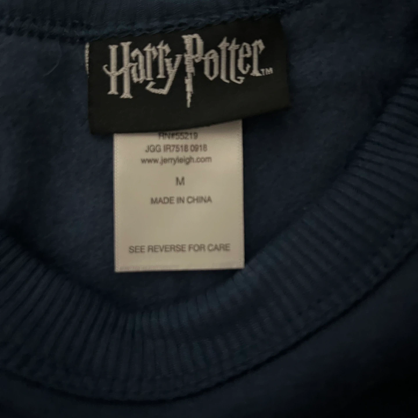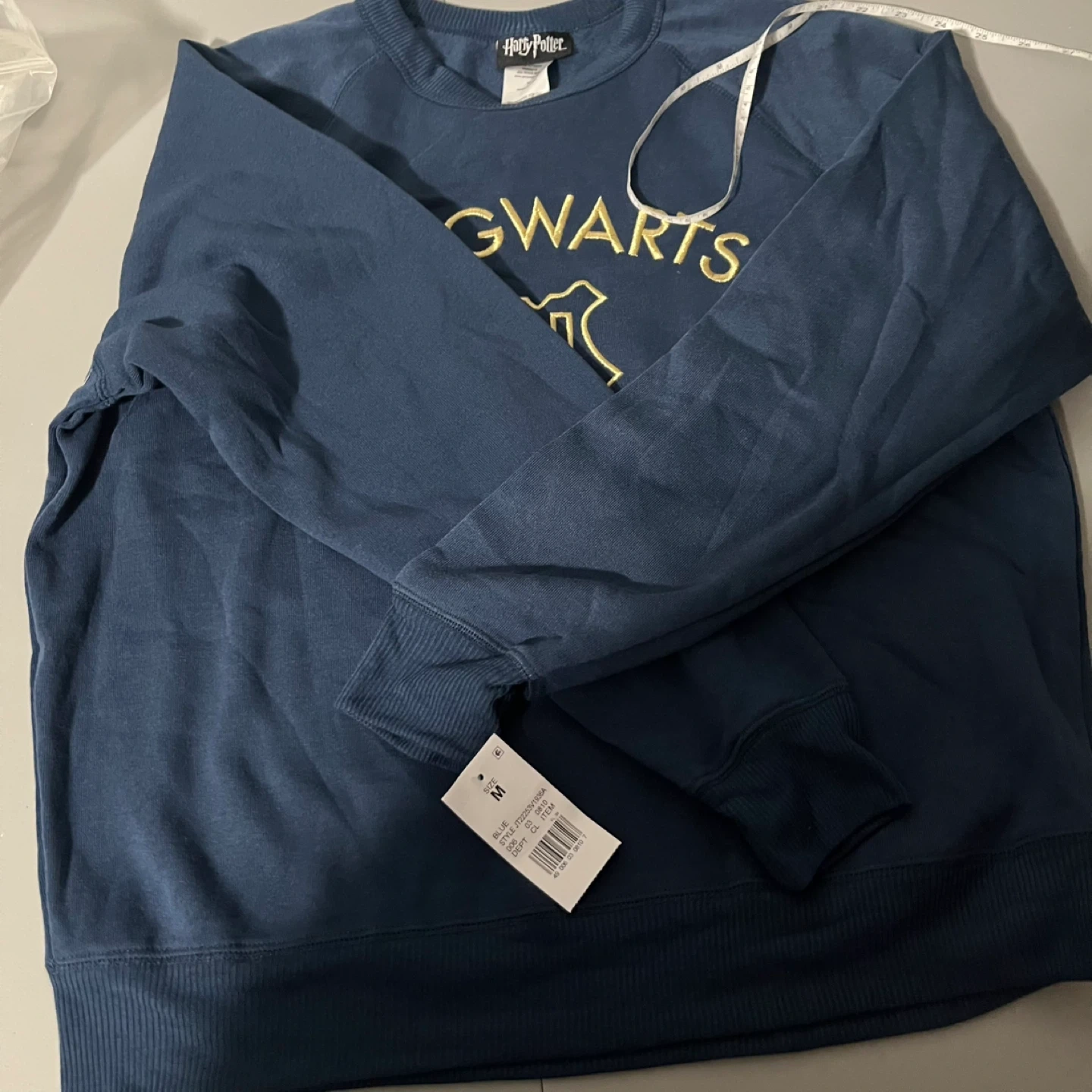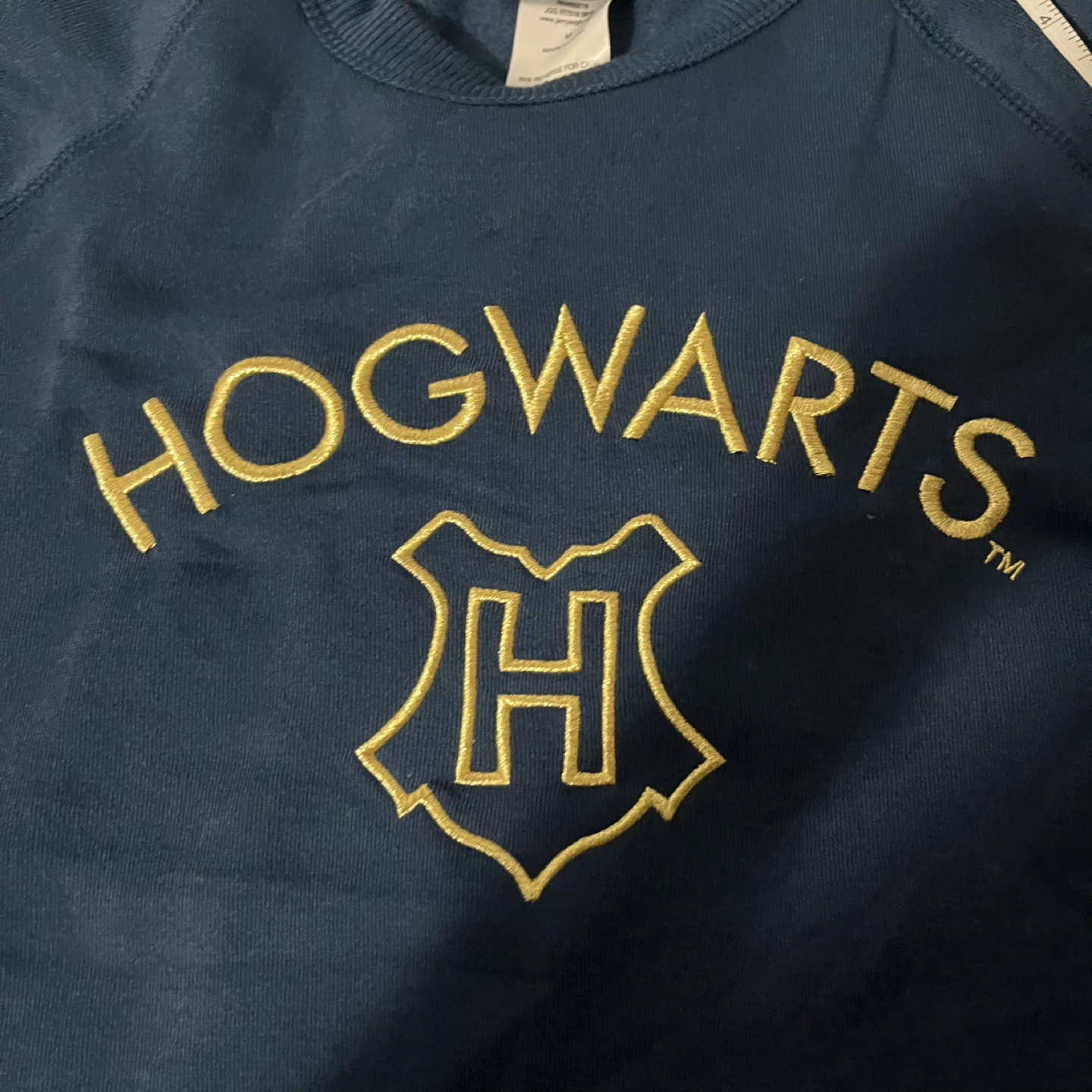 Cozy Harry Potter Hogwarts crewneck in a size medium! It's a navy blue colour with the Hogwarts crest on the front. The material is 65% polyester and 35% rayon, making it super comfy for lounging around the house or showing off your house pride