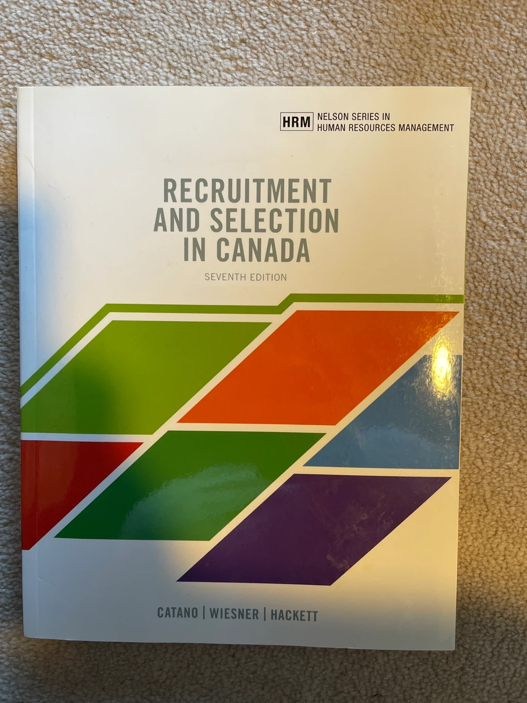 Selling a textbook titled 'Recruitment and Selection in Canada', seventh edition. It's part of the HRM Nelson Series in Human Resources Management, authored by Catano, Wiesner, and Hackett. Great resource for anyone studying human resources!