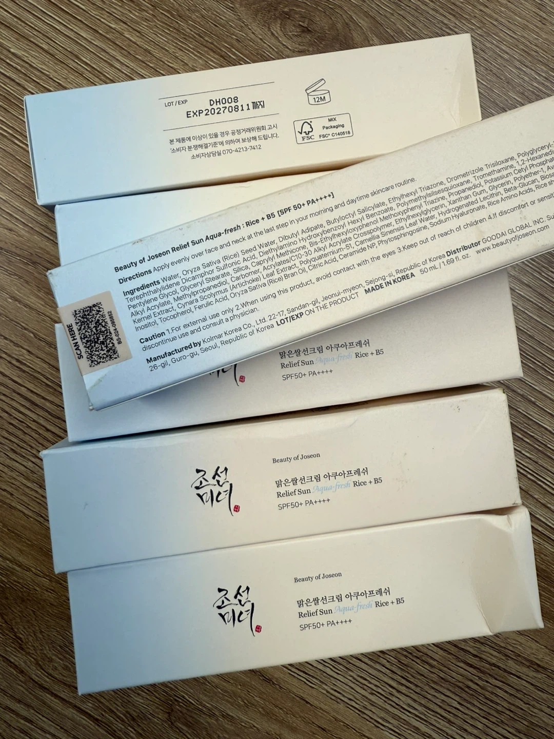 SEALED boxes of Beauty of Joseon Relief Sun Aqua Fresh Rice + B5 sunscreen. $15 EACH tube (6 boxes available) • K-beauty popular viral bestseller, TikTok favorite • No white cast, works on all skin tones • Lightweight, hydrating, perfect under makeup • Retail $22–27, I’m selling for $15 each (sealed, exp 2027) It's SPF50+ PA++++ and comes in a 50ml size. The expiration date is 2027 August 11. FYI - Beauty of Joseon stopped doing QR codes and their app support , so these are the last batches of boxes with QR seal … hence, sale price. Newer products will not have QR codes and App support.