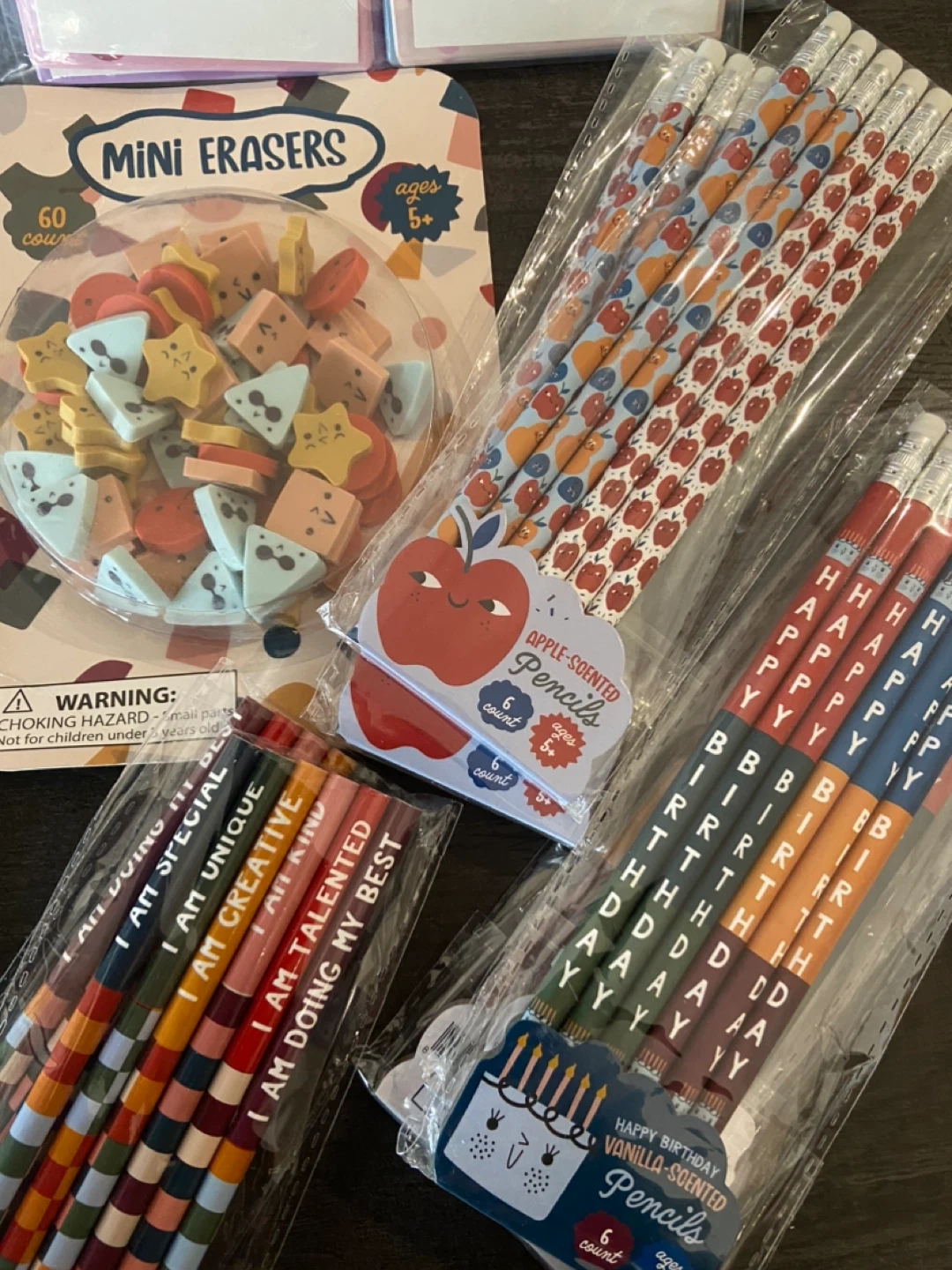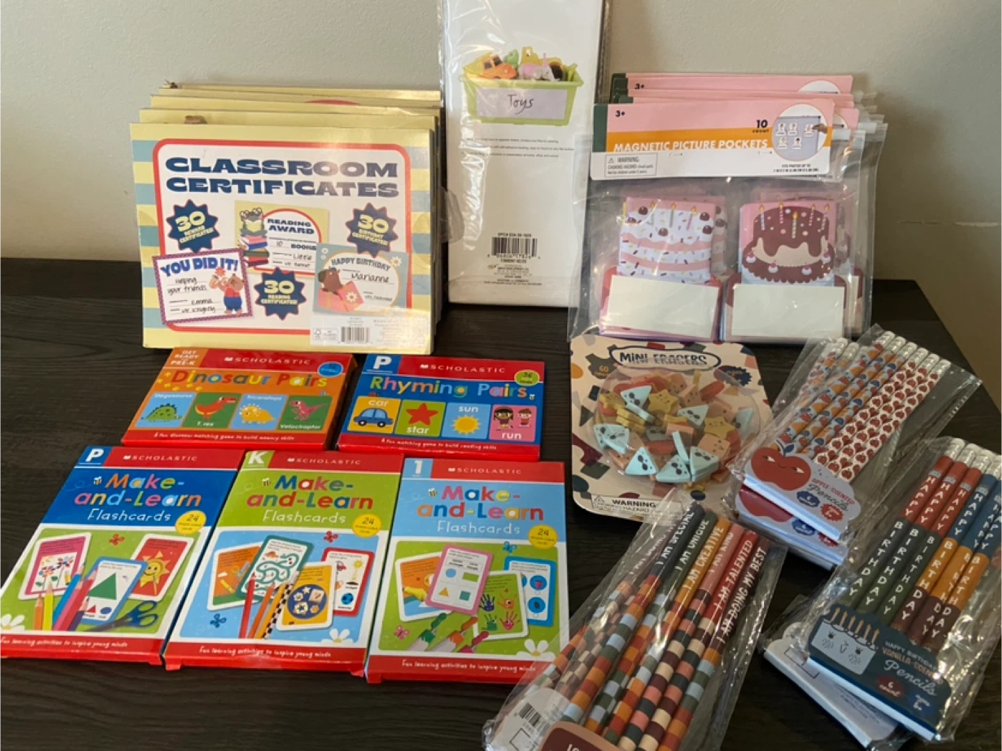 291New Teachers Resources Target Dollar Spot Items Multiples of each available (more than what’s in the photos) Classroom Certificates 90/pack $1/pack Adhesive Clear Labels 15/ pack $2 Attach label, paper slides into the pocket Magnetic Picture pockets 10/pack $2 Can slide paper in top and bottom. Perfect for alphabet, numbers, sight words, class birthday… magnetic Scholastic Packs $0.50 Perfect for prizes, class gifts Dinosaur matching game Rhyming Pairs Make and Learn Flash Cards Mini Erasers 60 count $1 6 pack Pencils $1 Scented Apple Pencils Happy Birthday Pencils Love Yourself Pencils Pickup in Whitby
