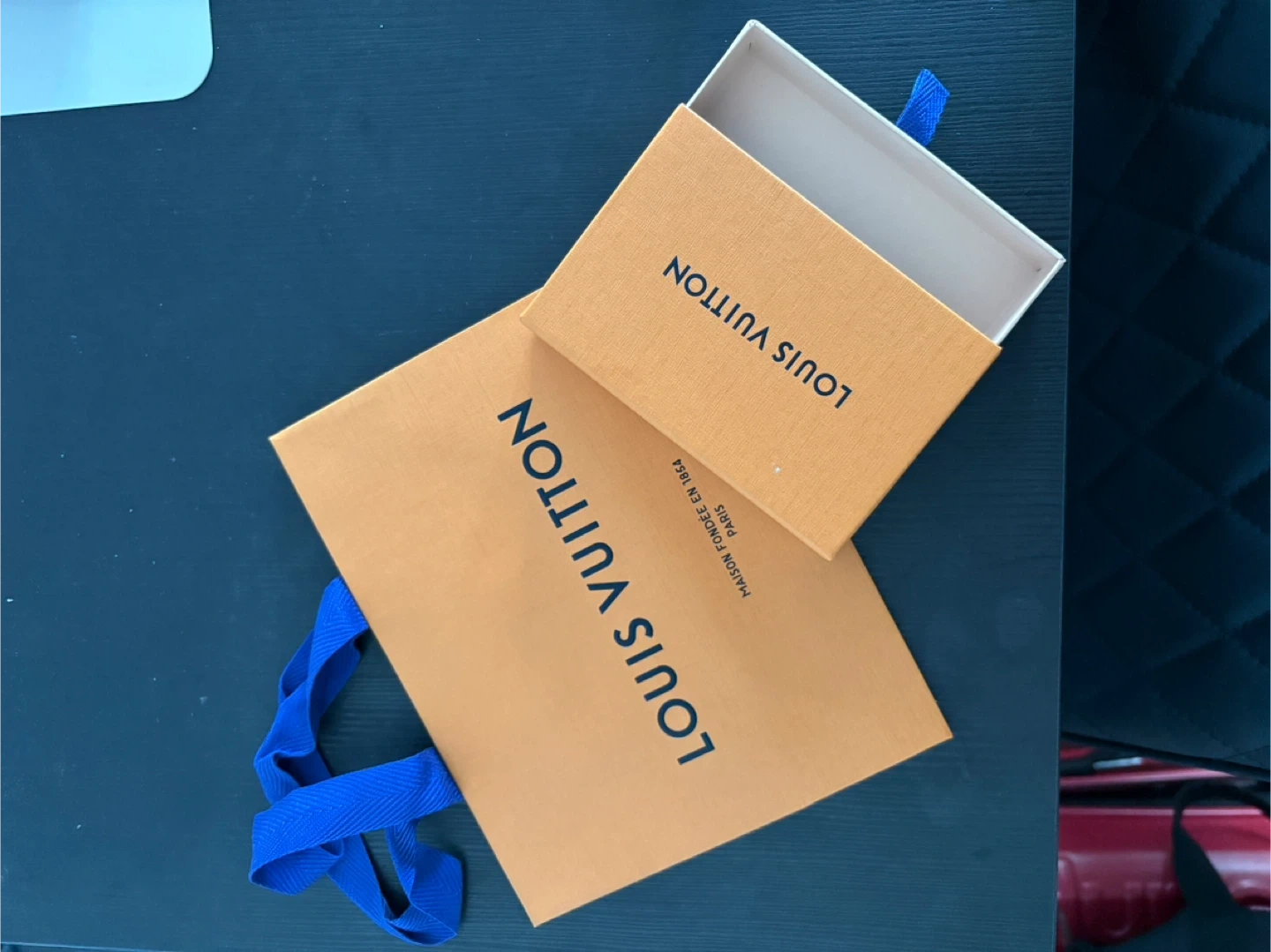Selling a Louis Vuitton box and bag. Perfect for gifting or storage! The box is in great condition and comes with a blue ribbon.