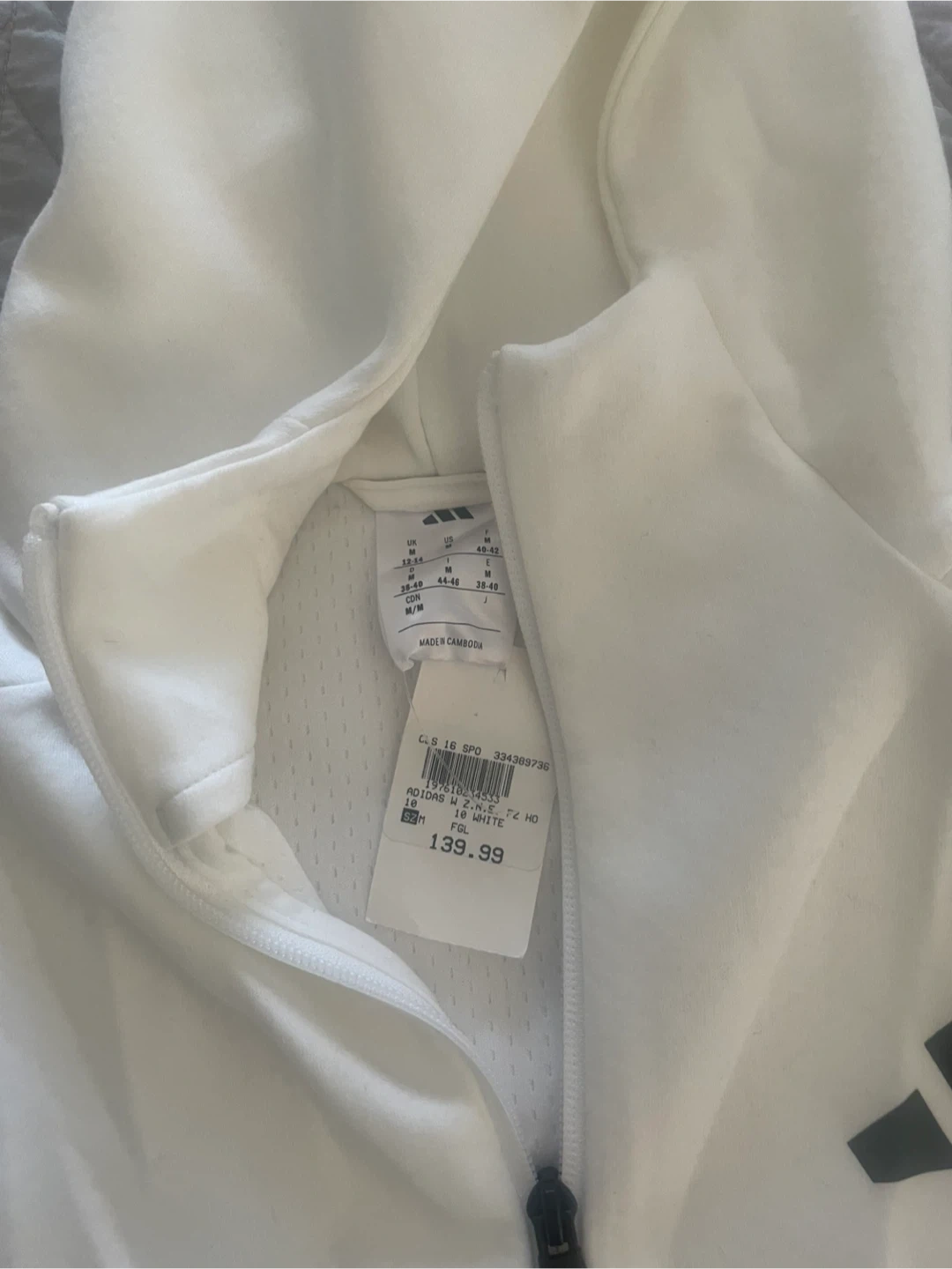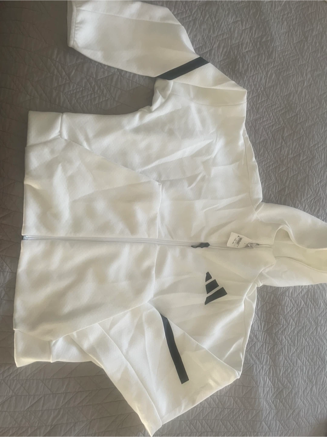 28Selling a brand new with tags Adidas Z.N.E. full-zip hoodie in white, size medium! Originally bought for $139.99. This hoodie is perfect for workouts or just lounging around. Super comfy and stylish!