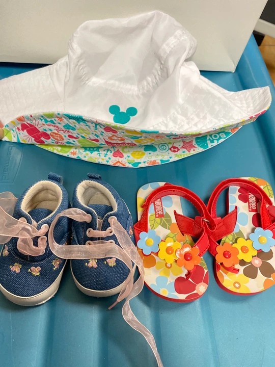Selling a Mickey Mouse Disney Summer Sun Hat and 1 pair Gymboree Sandal Flip flops and 1 pair Denim Sneakers from Children’s Place. Baby size 3-4. Gently used condition.