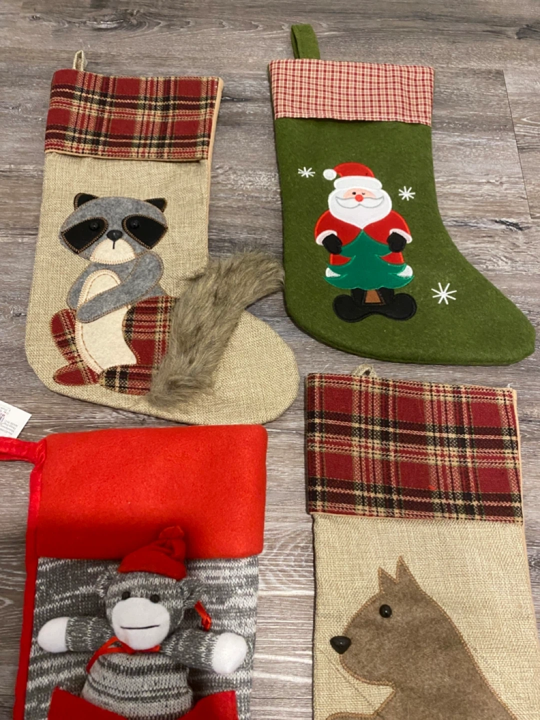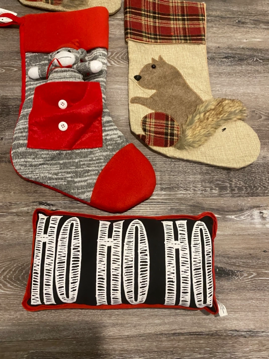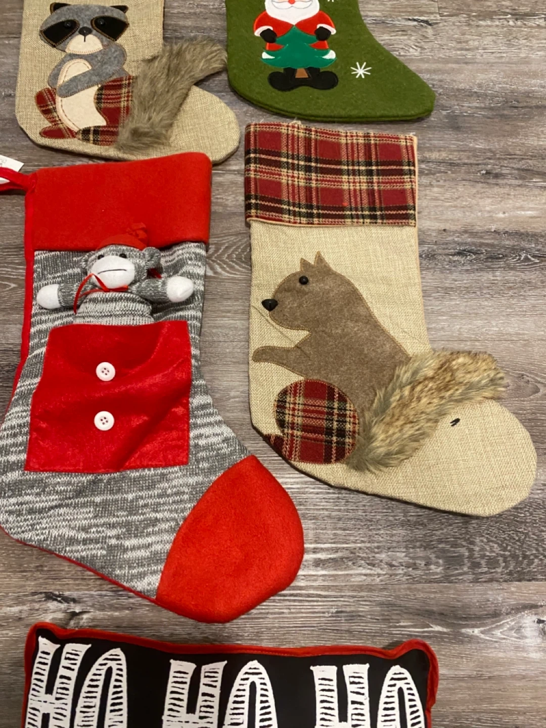 Selling a collection of Christmas stockings, each with unique designs like a raccoon, Santa, a sock monkey, and a squirrel! There's also a decorative pillow with "HO HO HO" written on it. They're all in great condition and ready to add some festive cheer to your home this holiday season All unused. Monkey is new with tag Pick up Sage Hill NW Cash only Pet and smoke free home Check out my other items